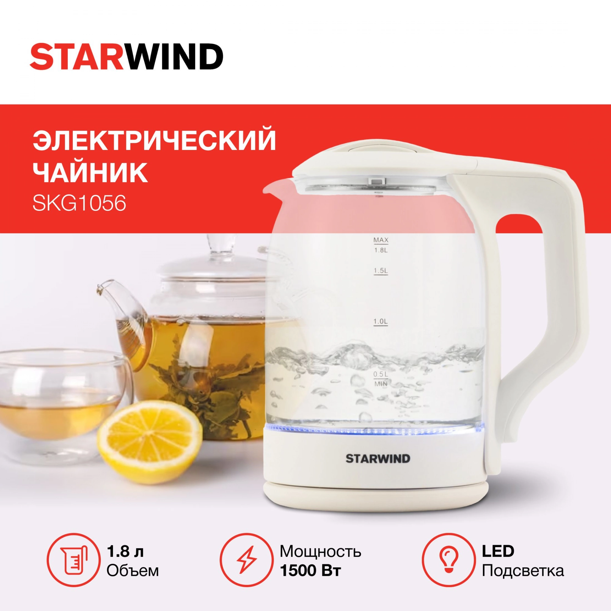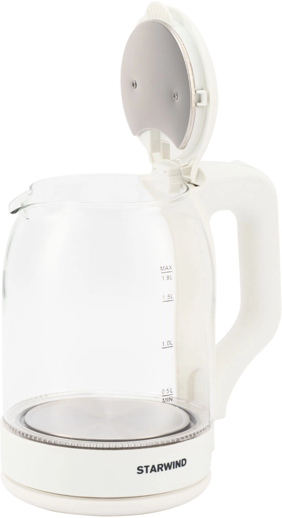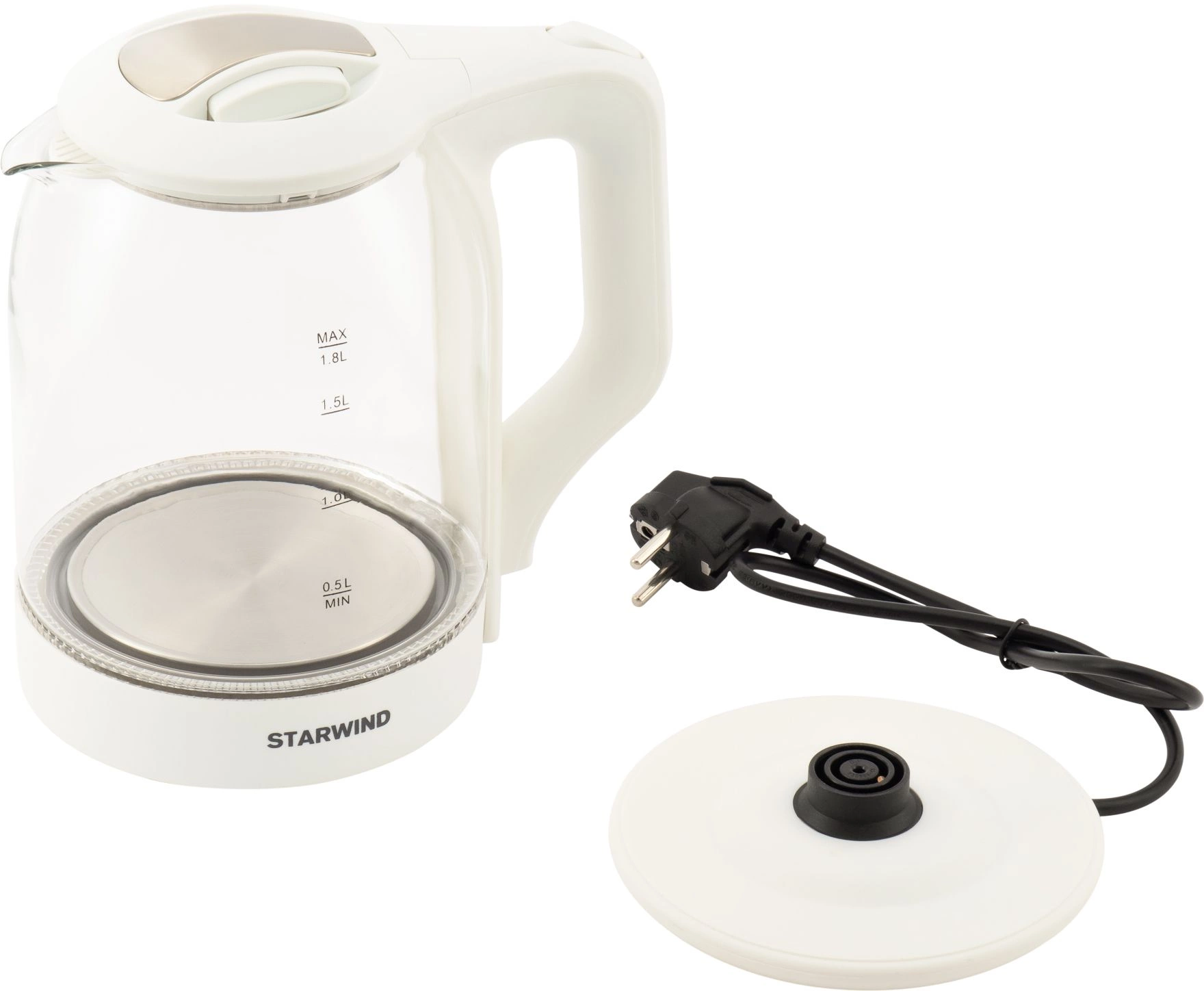 Прозрачный электрический чайник StarWind SKG1056 в стеклянном корпусе белого цвета будет привлекательно смотреться на любой кухне. За счет предусмотренной подсветки воды прибор эффектно работает в темноте. Достаточный объем резервуара позволяет кипятить воду в необходимом количестве. Во время эксплуатации техники светится индикатор. Для удобства использования имеется также и индикатор уровня, который позволяет не переполнить резервуар при наборе воды. Крышка открывается путем нажатия на кнопку. Имеется подставка, которая вращается на 360 градусов, что является дополнительным бонусом при использовании техники по назначению.