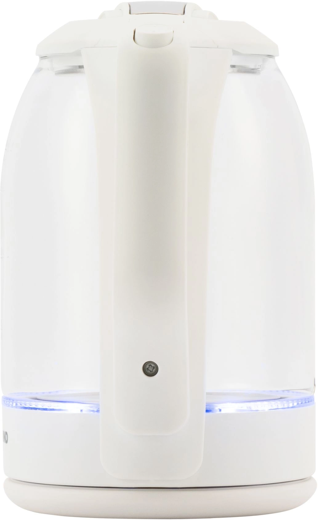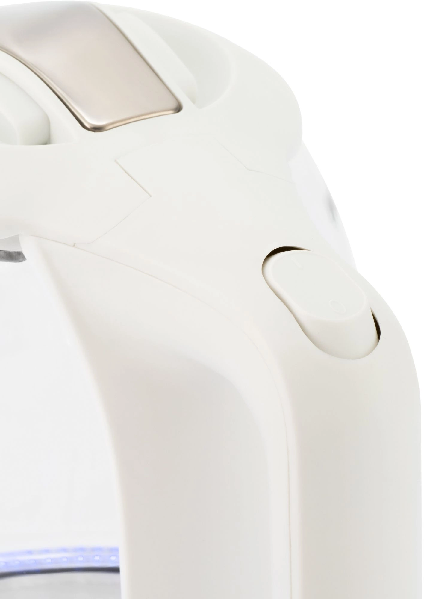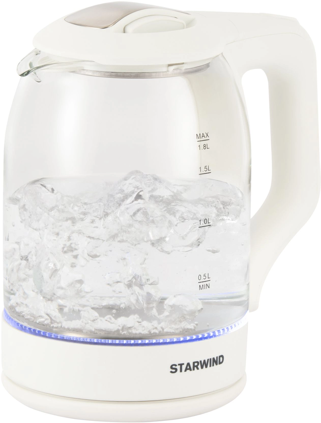 Прозрачный электрический чайник StarWind SKG1056 в стеклянном корпусе белого цвета будет привлекательно смотреться на любой кухне. За счет предусмотренной подсветки воды прибор эффектно работает в темноте. Достаточный объем резервуара позволяет кипятить воду в необходимом количестве. Во время эксплуатации техники светится индикатор. Для удобства использования имеется также и индикатор уровня, который позволяет не переполнить резервуар при наборе воды. Крышка открывается путем нажатия на кнопку. Имеется подставка, которая вращается на 360 градусов, что является дополнительным бонусом при использовании техники по назначению.