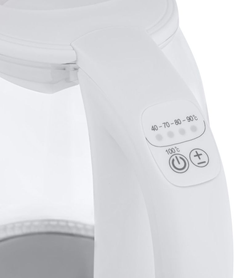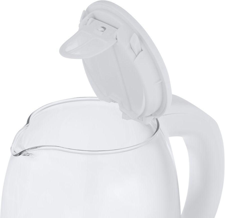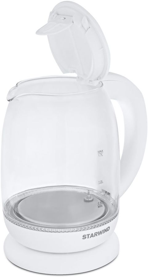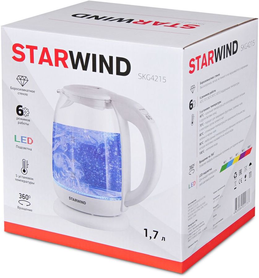 мощность 2200Вт; объем 1.7л; корпус стекло и пластик; фильтр от накипи, регулировка температуры; поддержание температуры; подсветка воды; сигнал при закипании цвет белый