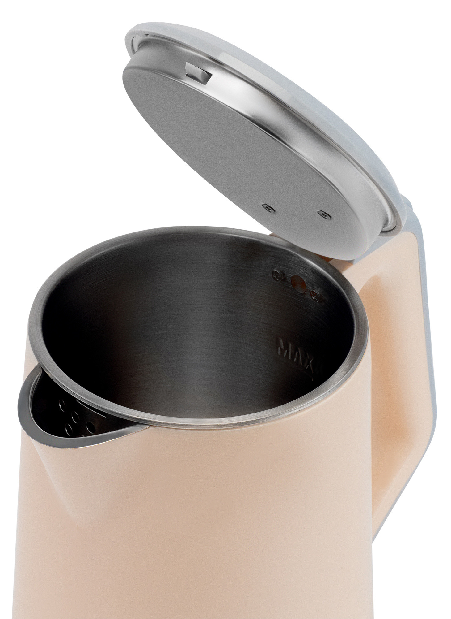 Особенности: Чайник имеет двойные стенки – внутри металлическая колба из нержавеющей стали, снаружи пластиковый корпус. Это делает чайник более безопасным, предотвращает случайные ожоги, а так же сохраняет воду теплой дольше.
