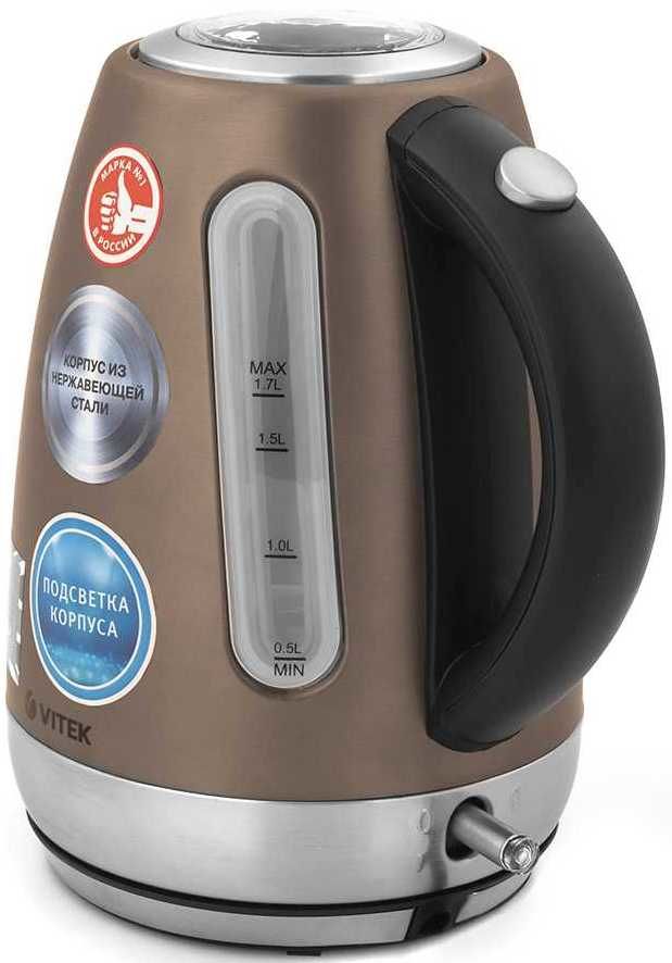 Чтобы чайник электрический VITEK VT-7025 мощностью 2150 Вт вскипятил 1.7 л воды понадобится всего несколько минут, поэтому устроить большое чаепитие не сложно. Его корпус выполнен из прочной, пищевой стали. Она не подвергается коррозии, не вступает в реакции с химически агрессивными соединениями, полностью соответствует требованиям качества и безопасности, как и использованный в дизайне прочный, термоустойчивый пластик. Все лучшие свойства воды в таком приборе будут сохранены, но частицы накипи или других примесей в чашку не пропустит установленный в носике фильтр.