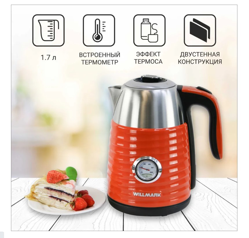 Чайник WILLMARK WEK-1738PST современный чайник с удобной ручкой, мощностью 2200Вт, объёмом 1,7 литра,с закрытым нагревательным элементом из нержавеющей стали. Удобен в эксплуатации, позволяет легко контролировать температуру воды благодаря встроенному термометру. Чайник электрический WEK-1738PST имеет двухстенную конструкцию, в которая наружняя часть выполнена из экологически безопасного пищевого пластика, внутренняя - из нержавеющей стали. Благодаря такой конструкции наружная поверхность чайника не нагревается, а при нагреве воды существенно снижается уровень шума и срок закипания. Технология термоса с двумя стенками позволит воде дольше оставаться горячей и снизит затраты на электроэнергию.