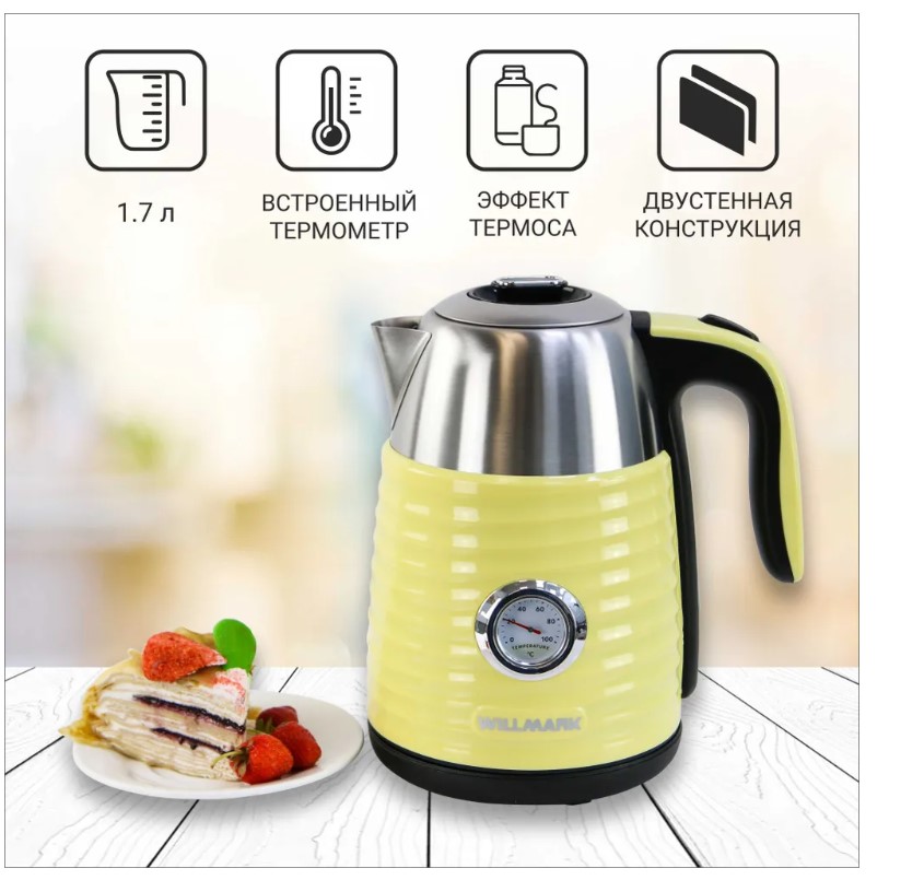 Чайник WILLMARK WEK-1738PST современный чайник с удобной ручкой, мощностью 2200Вт, объёмом 1,7 литра,с закрытым нагревательным элементом из нержавеющей стали. Удобен в эксплуатации, позволяет легко контролировать температуру воды благодаря встроенному термометру. Чайник электрический WEK-1738PST имеет двухстенную конструкцию, в которая наружняя часть выполнена из экологически безопасного пищевого пластика, внутренняя - из нержавеющей стали. Благодаря такой конструкции наружная поверхность чайника не нагревается, а при нагреве воды существенно снижается уровень шума и срок закипания. Технология термоса с двумя стенками позволит воде дольше оставаться горячей и снизит затраты на электроэнергию.