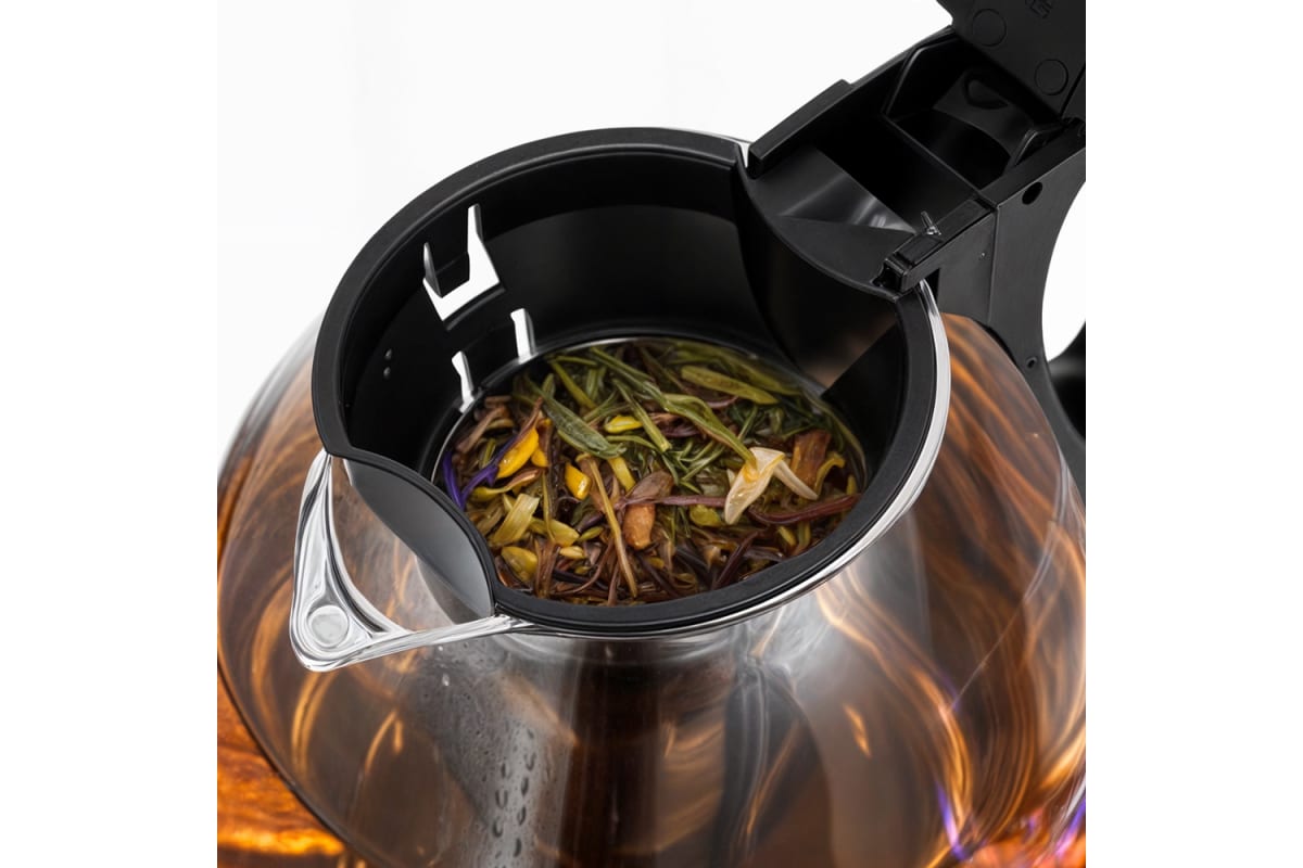 Заварочный чайник изготовлен из термостойкого стекла и имеет съемный фильтр для чая или кофе. В месте установки заварочного чайника на базу находится платформа с подогревом, благодаря которой вы можете сохранить готовый напиток теплым в течение.