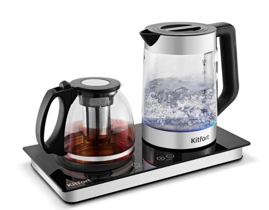 Чайный набор КТ-6650 состоит из чайника ёмкостью 1,8 л, заварочного чайника ёмкостью 1,2 л с фильтром и базы. Чайный набор позволяет не только вскипятить воду, но и заварить чай или кофе в заварочном чайнике.