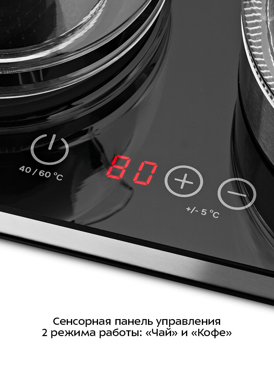Сенсорная панель управления позволяет выбрать режим работы: «Чай» или «Кофе», выбрать температуру для режимов от 40 до 60 °С с шагом 5 °С и выключить устройство. Во время работы платформы с подогревом отображается установленная температура.