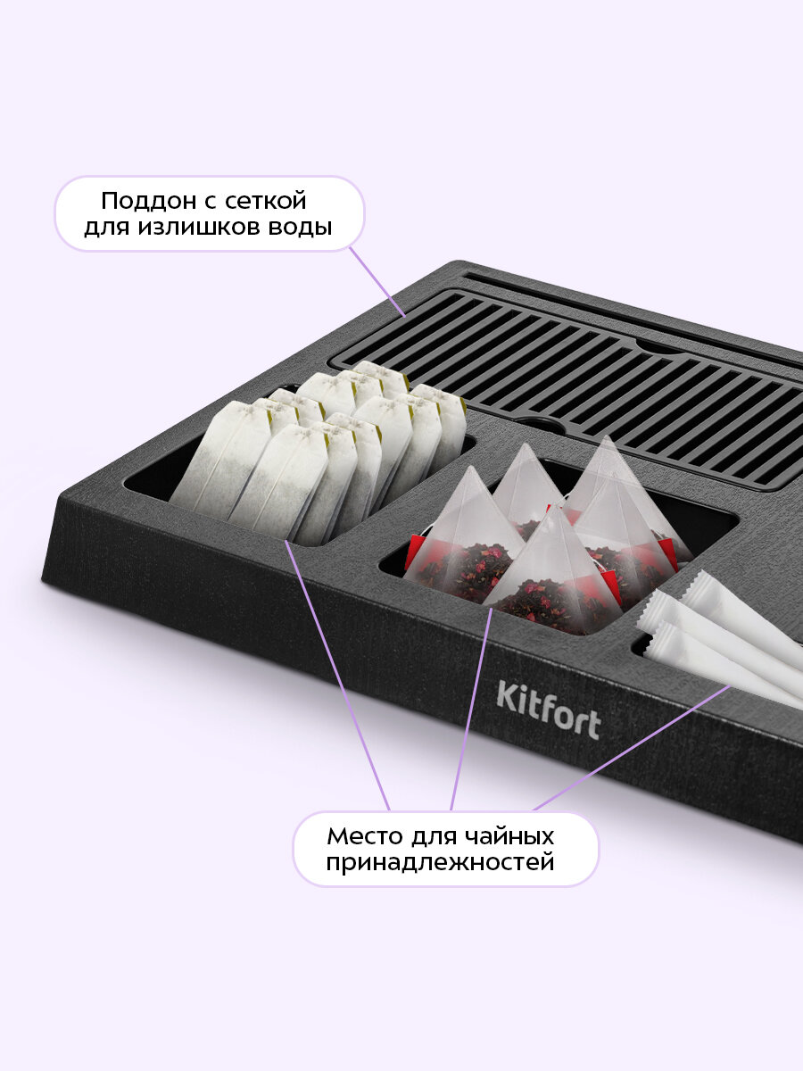 Подставка имеет 2 прямоугольных отсека для хранения различного вида чайных принадлежностей. Чай, сахар, кофе, храните всё под рукой! Также на подставке есть поддон с решёткой для предотвращения разлития случайно пролитой воды во время заваривания.