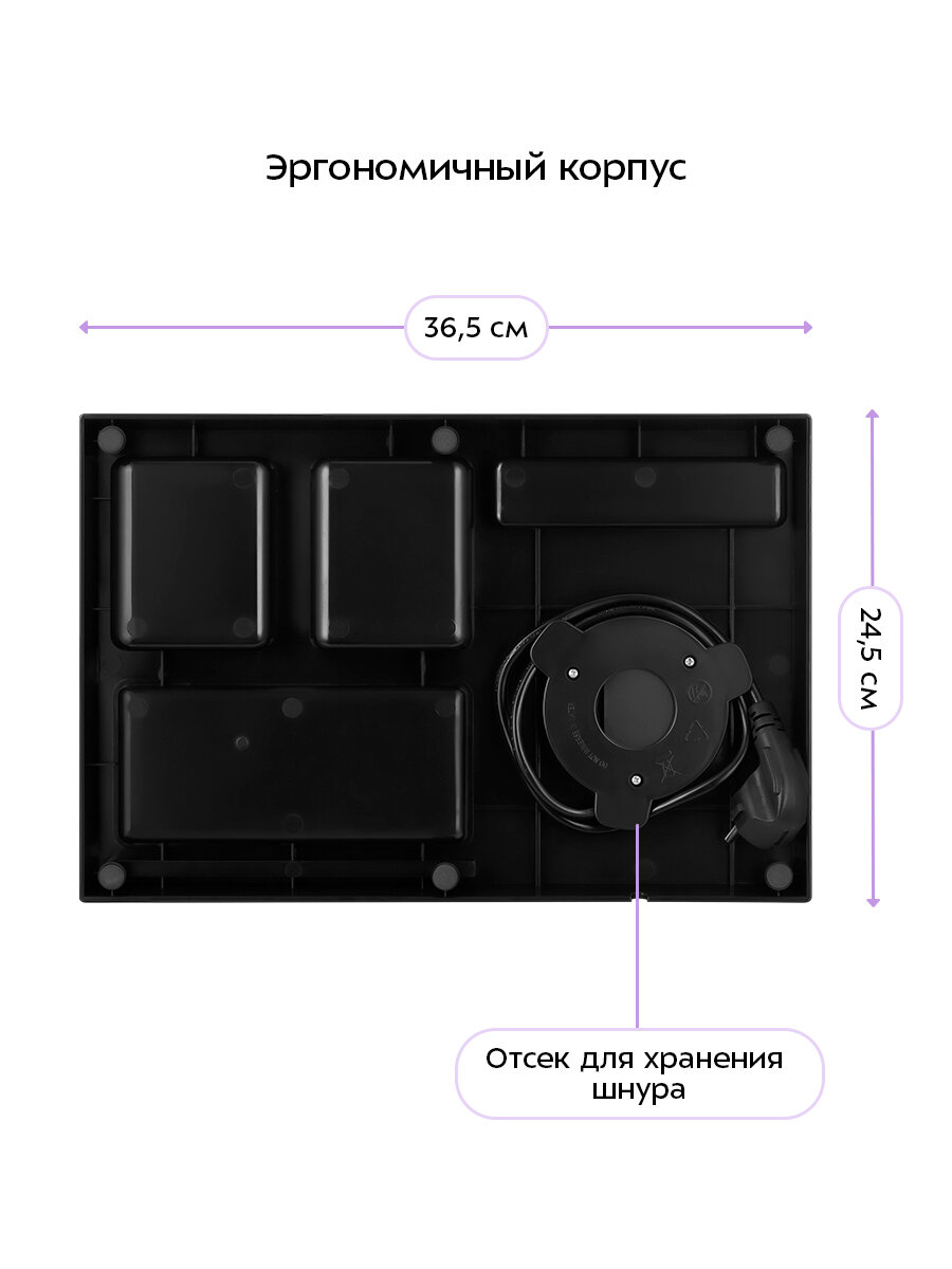 Подставка имеет эргономичный корпус оптимального размера. Также, под местом расположения чайника, расположен отсек для хранения шнура, что позволит смотать лишние провода при использовании или убрать его вовсе при необходимости.