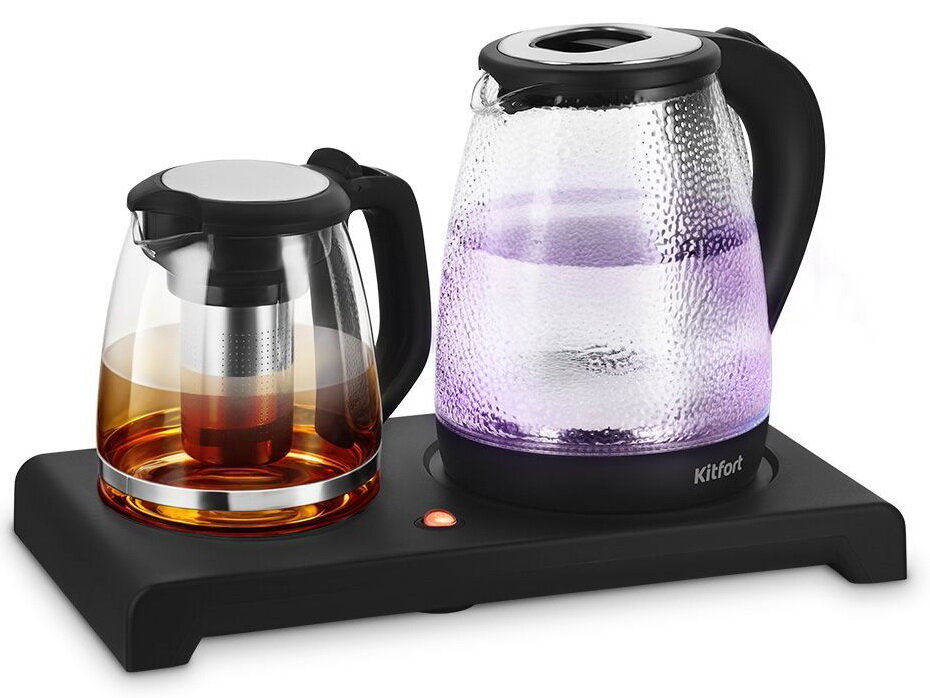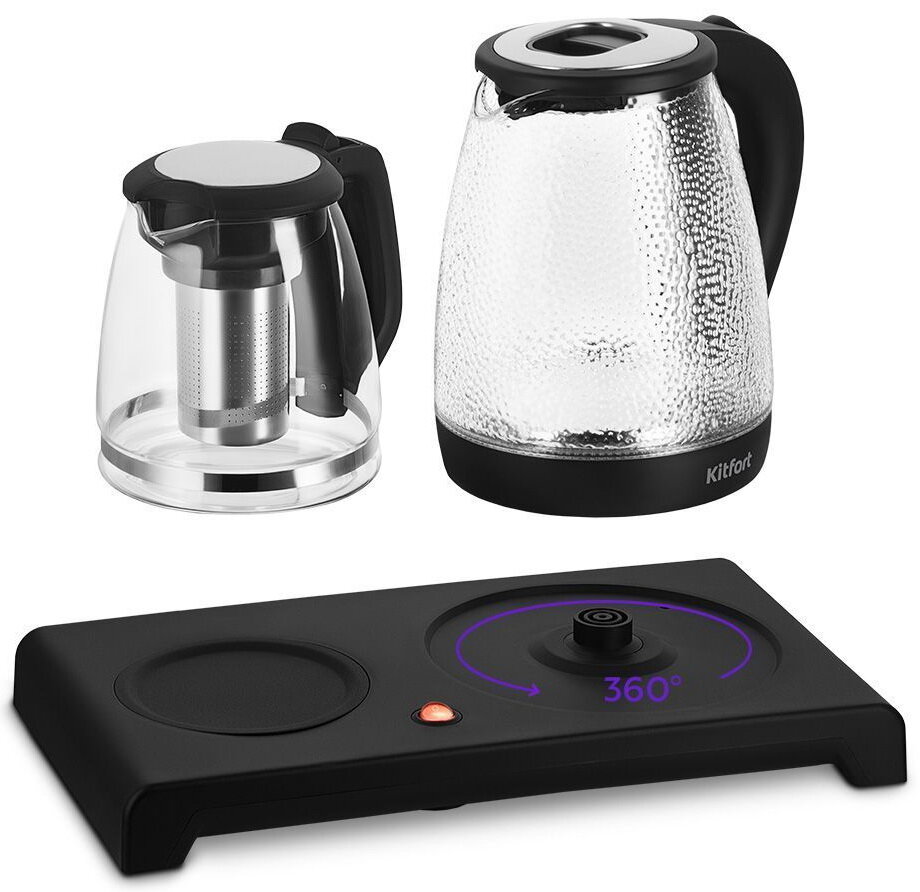 Чайный набор КТ-6734 состоит из чайника ёмкостью 2 л, заварочного чайника с фильтром ёмкостью 1,2 л и базы. Набор поможет вам не только вскипятить воду, но и заварить чай или кофе, а также сохранить готовый напиток тёплым.