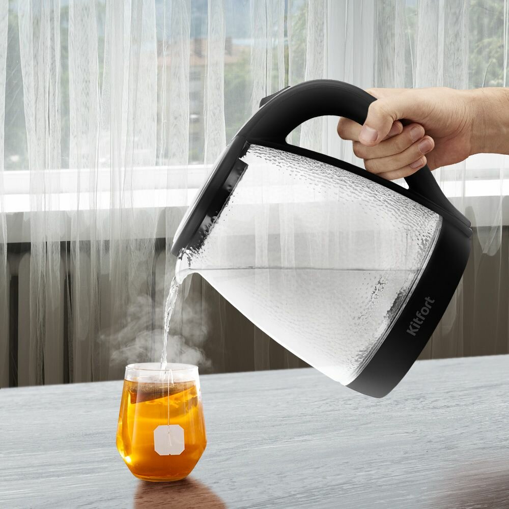 Корпус чайника выполнен из стекла и пластика, а крышка — из пластика и нержавеющей стали. Пластиковая ручка чайника позволяет удобно держать его в руке: ручка не скользит и не нагревается благодаря особенностям конструкции.