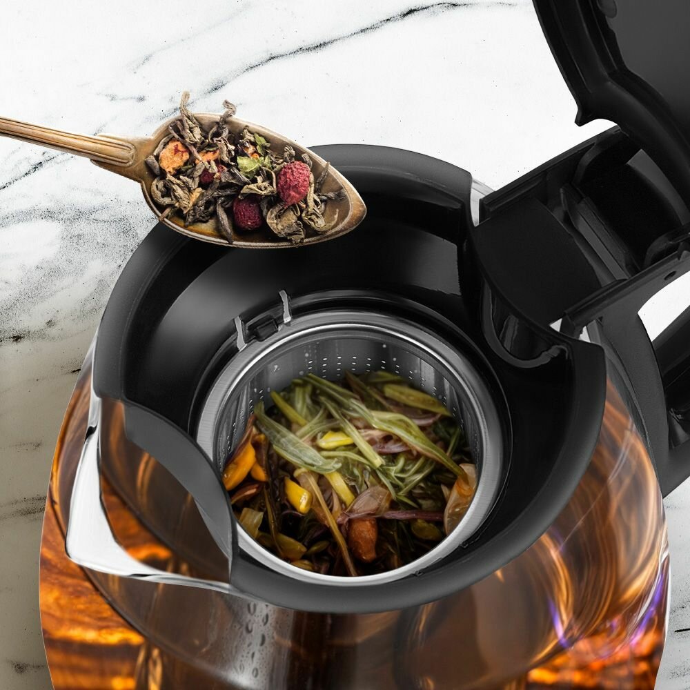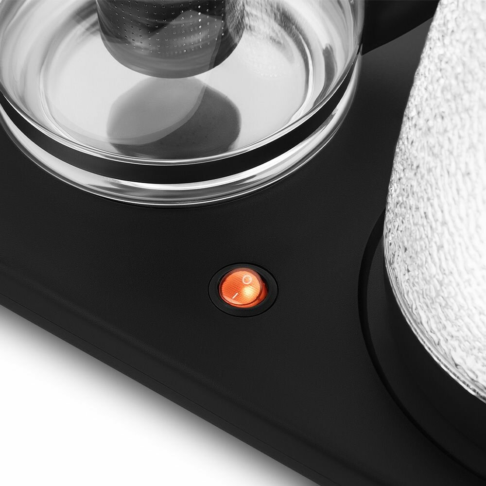 Заварочный чайник изготовлен из термостойкого стекла и имеет съёмный фильтр из нержавеющей стали для чая или кофе. В месте установки заварочного чайника на базу находится платформа с подогревом, благодаря которой можно сохранять готовый напиток тёплым.
