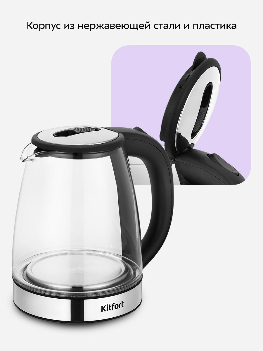 Внешняя часть корпуса выполнена из пластика и нержавеющей стали, а внутренняя − из стекла. Крышка чайника пластиковая со вставками из нержавеющей стали. Пластиковая ручка чайника не скользит и не нагревается благодаря особенностям конструкции.