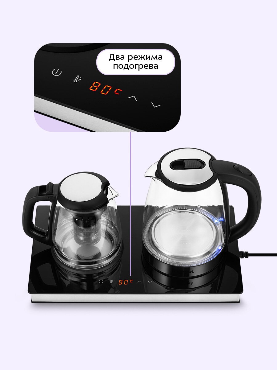Заварочный чайник изготовлен из термостойкого стекла и имеет съёмный фильтр из нержавеющей стали для чая или кофе. В месте установки заварочного чайника на базу находится платформа с подогревом, благодаря которой можно сохранять готовый напиток тёплым.