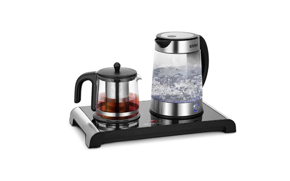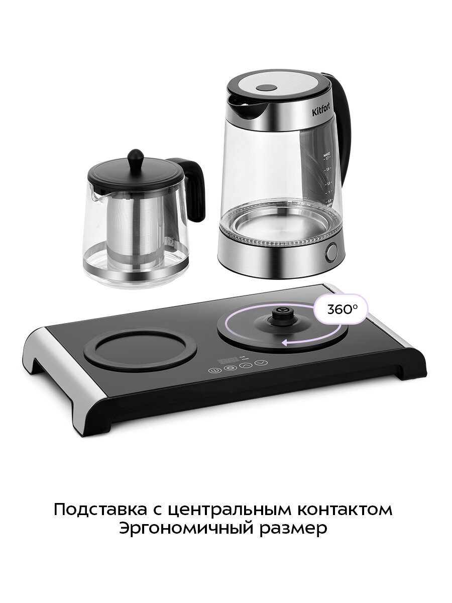 Чайный набор КТ-6743 состоит из чайника, заварочного чайника с фильтром и базы. Набор позволяет не только вскипятить воду, но и заварить чай или кофе, а также сохранить готовый напиток тёплым в течение 4 часов за счёт платформы с подогревом.
