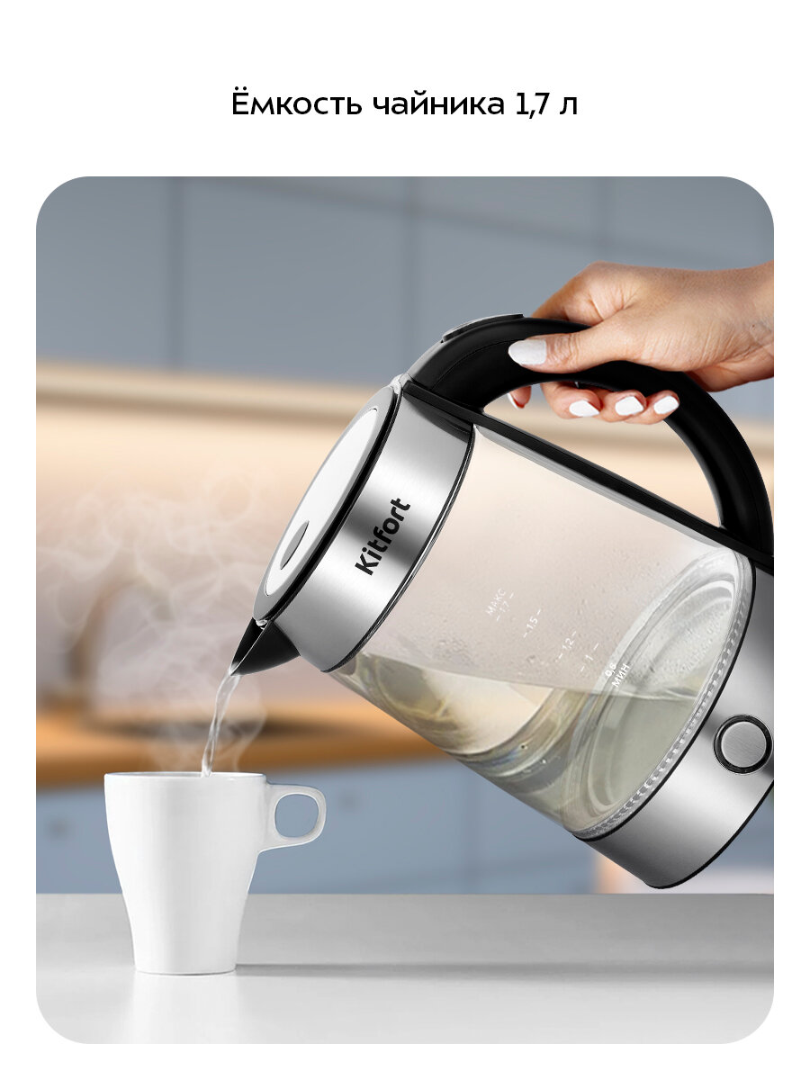 Центральный контакт для чайника на базе дает возможность ставить его на базу в любом положении, обеспечивая вращение на 360°, а эргономичный корпус впишется в любой интерьер. Полный чайник закипает за 5—7 минут.