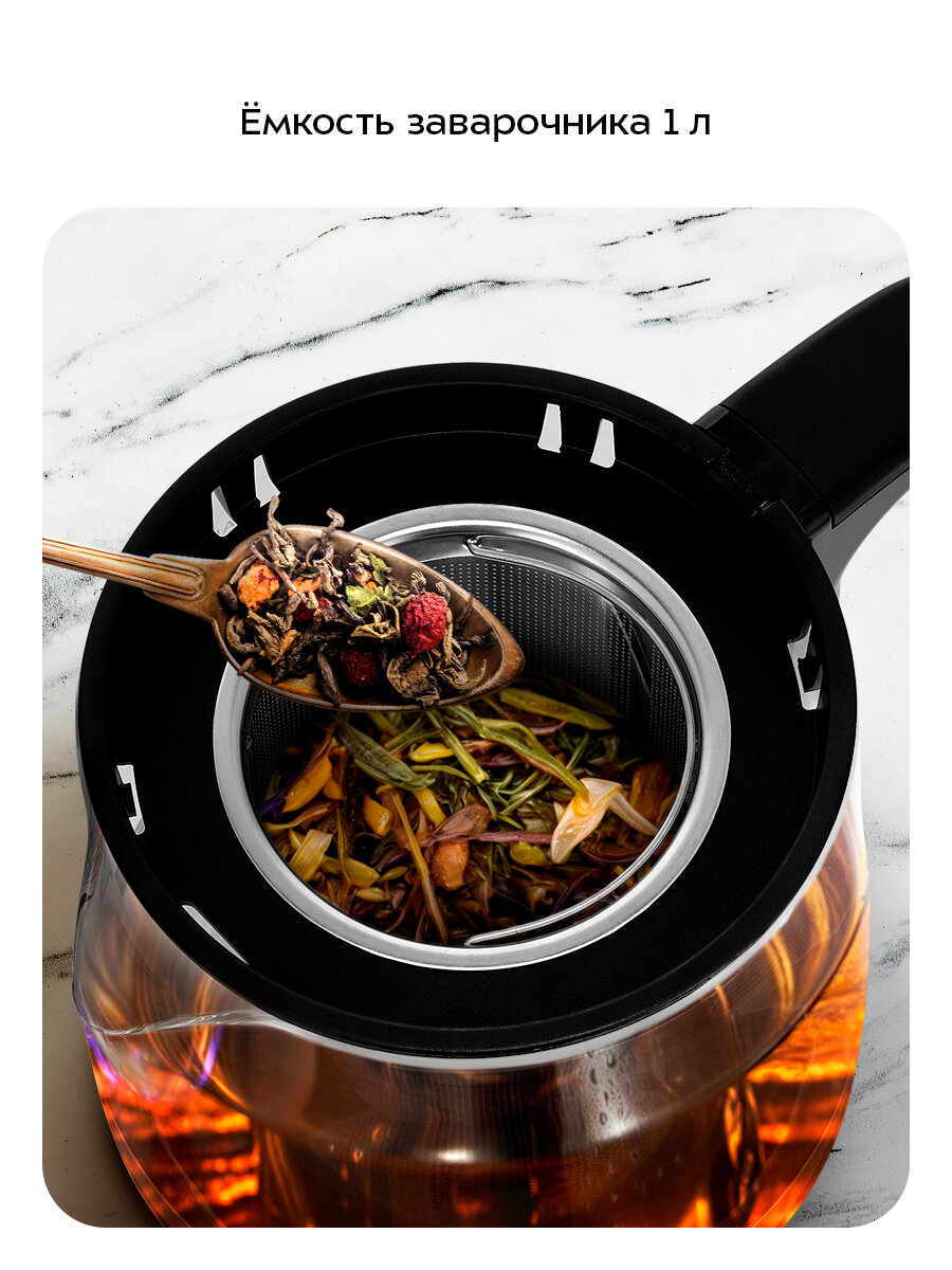 Заварочный чайник изготовлен из термостойкого стекла и имеет съёмный фильтр из нержавеющей стали для чая или кофе. В месте установки заварочного чайника на базе находится платформа с подогревом, которая сохранит напиток тёплым в течение 4 часов.