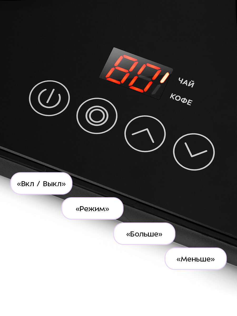 Управление платформой осуществляется при помощи сенсорных кнопок на корпусе. Во время работы платформы на дисплее отображается установленная температура нагрева. Кнопка «Режим» циклически переключает два режима работы платформы с подогревом: Чай и Кофе.