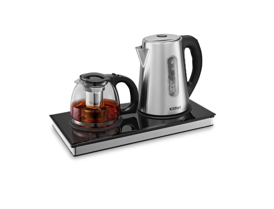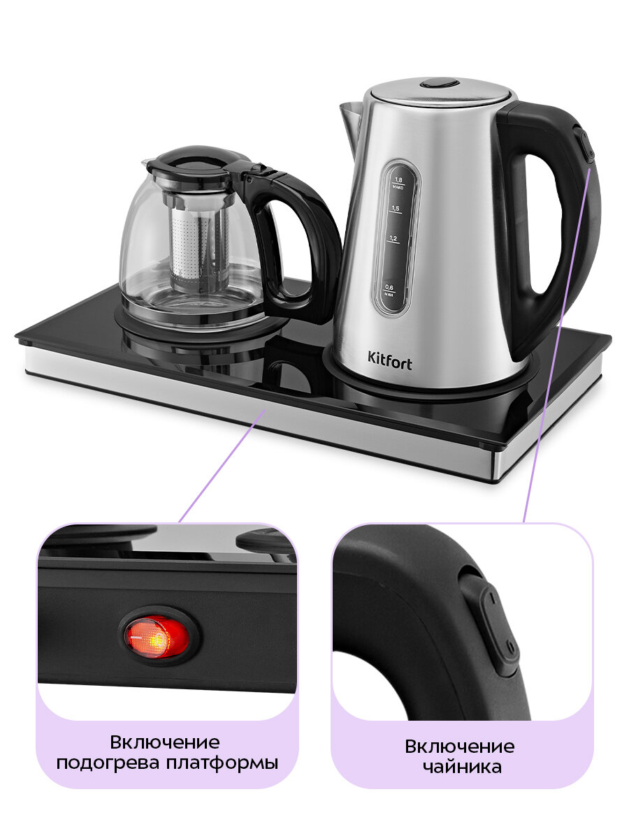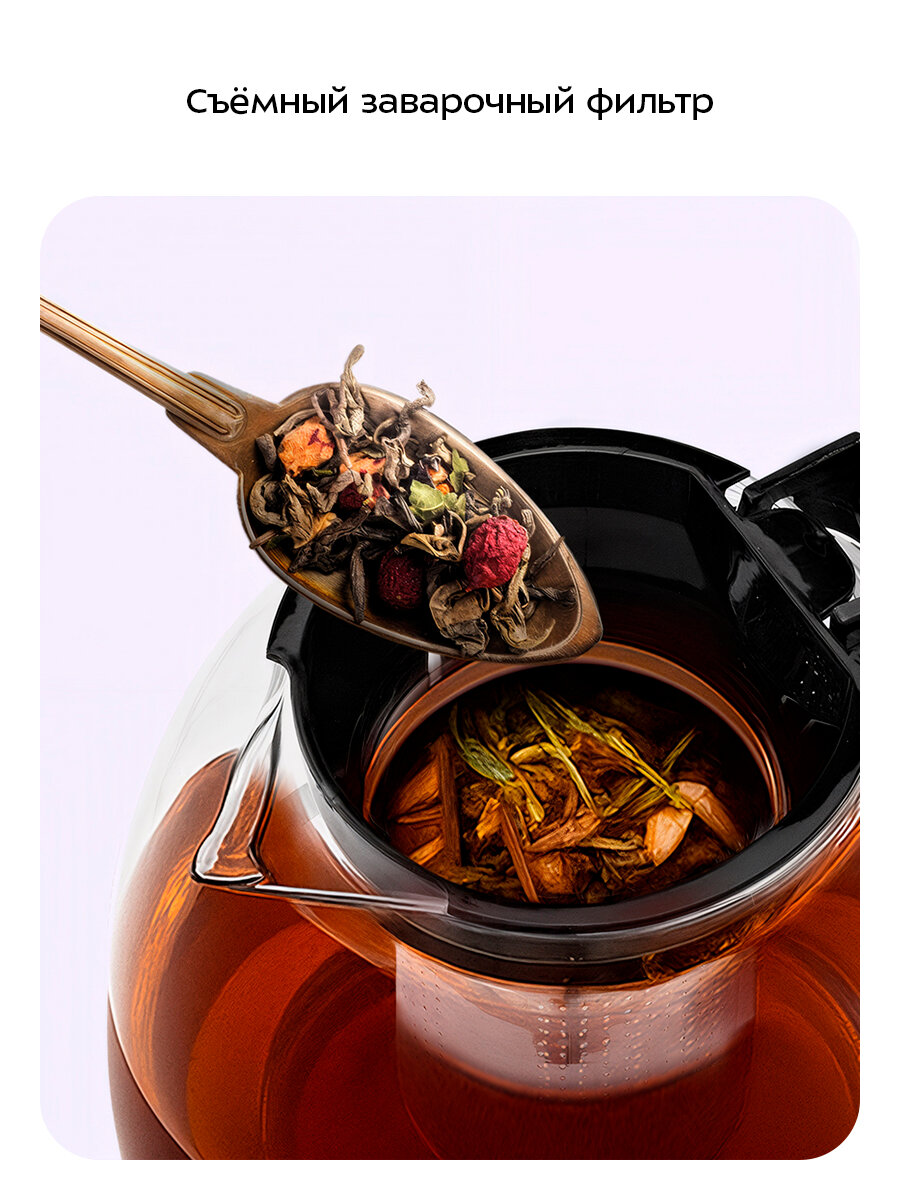 Заварочный чайник изготовлен из термостойкого стекла и имеет съёмный фильтр для чая или кофе. В месте установки заварочного чайника на базу находится платформа с подогревом, благодаря которой готовый напиток остаётся тёплым.