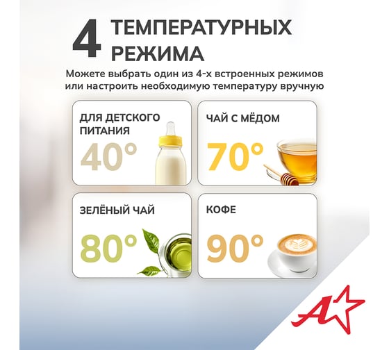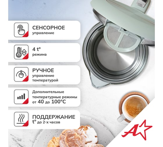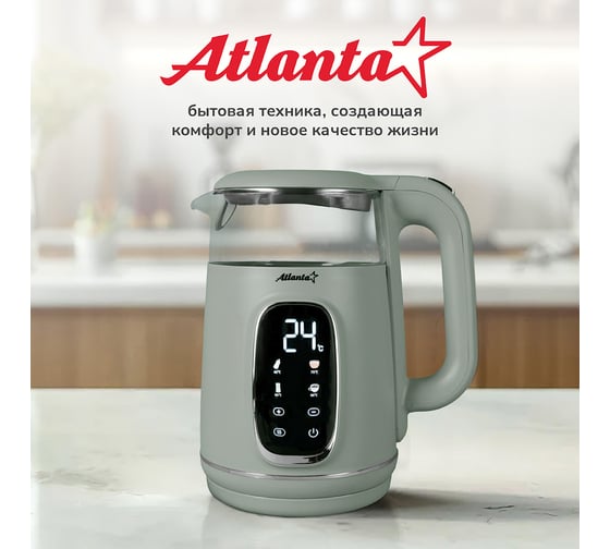 Электрический чайник Atlanta — это стильный и функциональный прибор, который станет незаменимым помощником на вашей кухне. Двойные стенки чайника обеспечивают эффективное сохранение тепла, а вращение на подставке на 360° гарантирует удобство использования. Вы можете выбрать одну из четырех температурных настроек, чтобы приготовить идеальный напиток для любого случая. Корпус из нержавеющей стали и пластика придает чайнику прочность и элегантный внешний вид. Удобное управление делает процесс использования простым и интуитивно понятным.