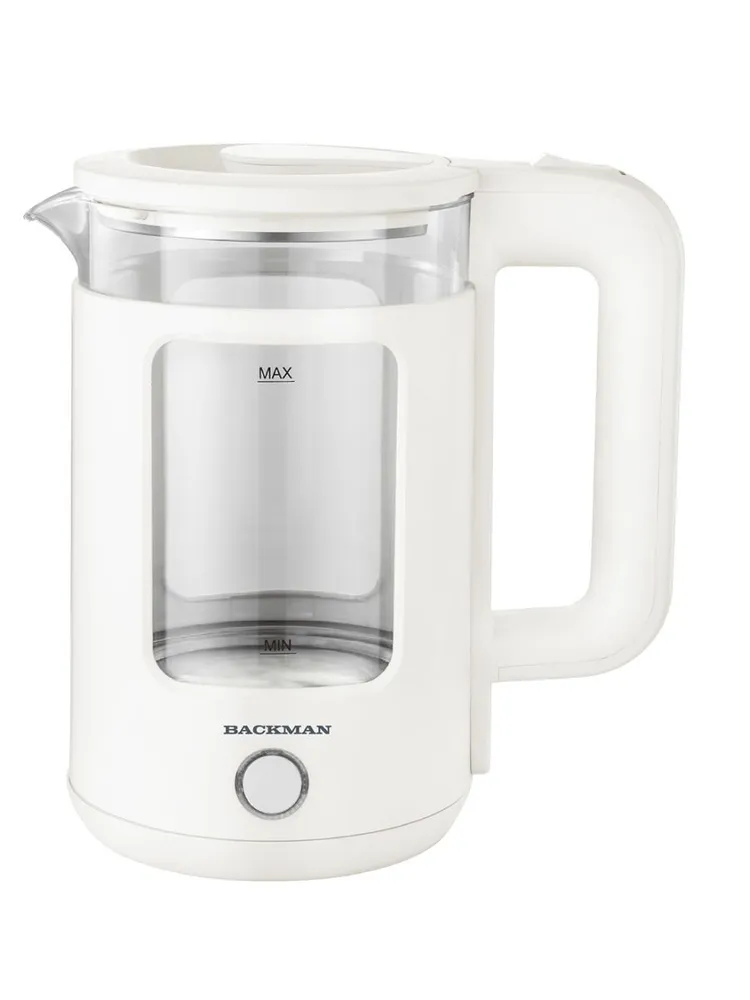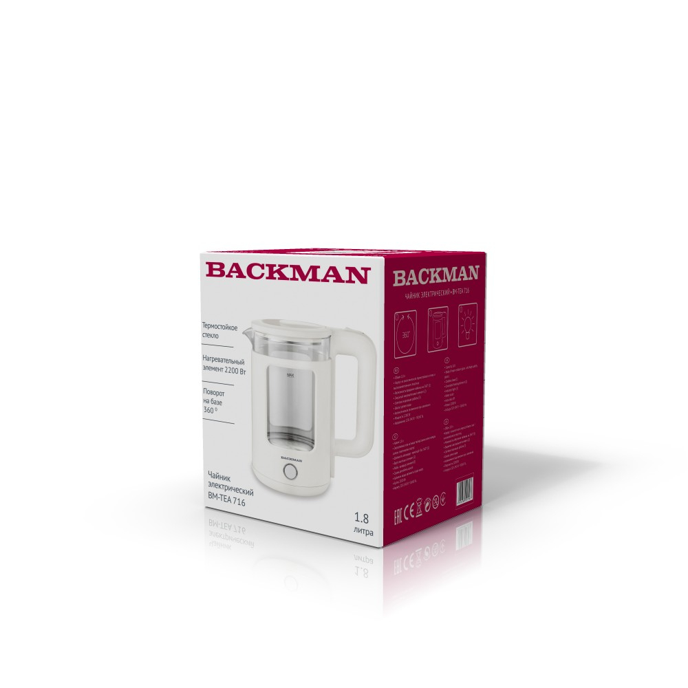 Электрочайник BACKMAN BM-TEA 716 1,8л, Электрочайник, 2200 Вт, 1,8 литра, корпус из высококачественного термостойкого стекла и пластика, закрытый нагревательный элемент, вращение подставки на 360°, световой индикатор работы, шкала уровня воды, автоматическое отключение при закипании, автоматическое отключение без воды.