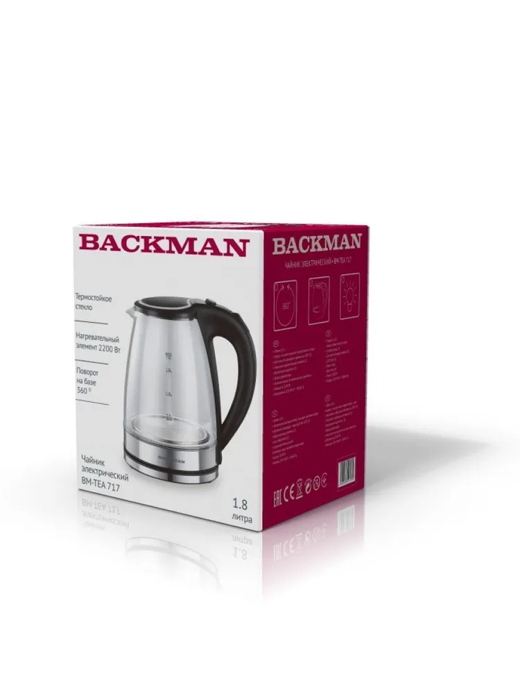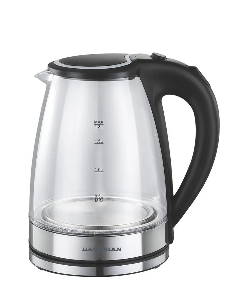 Электрочайник BACKMAN BM-TEA 716 1,8 л, корпус из высококачественного термостойкого стекла и пластика, закрытый нагревательный элемент, вращение подставки на 360°, световой индикатор работы, шкала уровня воды, автоматическое отключение при закипании, автоматическое отключение без воды.