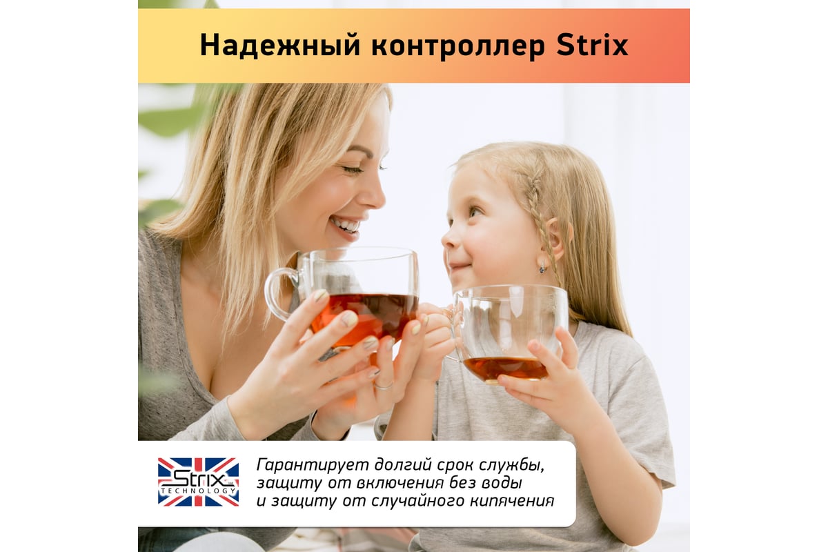 Чайник имеет мощность в 1850-2200 Вт и высококачественный английский контроллер Strix, который гарантирует долгий срок службы и бесперебойную работу устройства. Strix гарантирует защиту от включения без воды и защиту от случайного кипячения. Можете быть уверены, что чайник прослужит долгие годы, радуя вас своей надежностью и функциональностью.