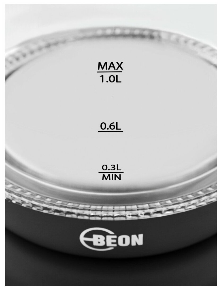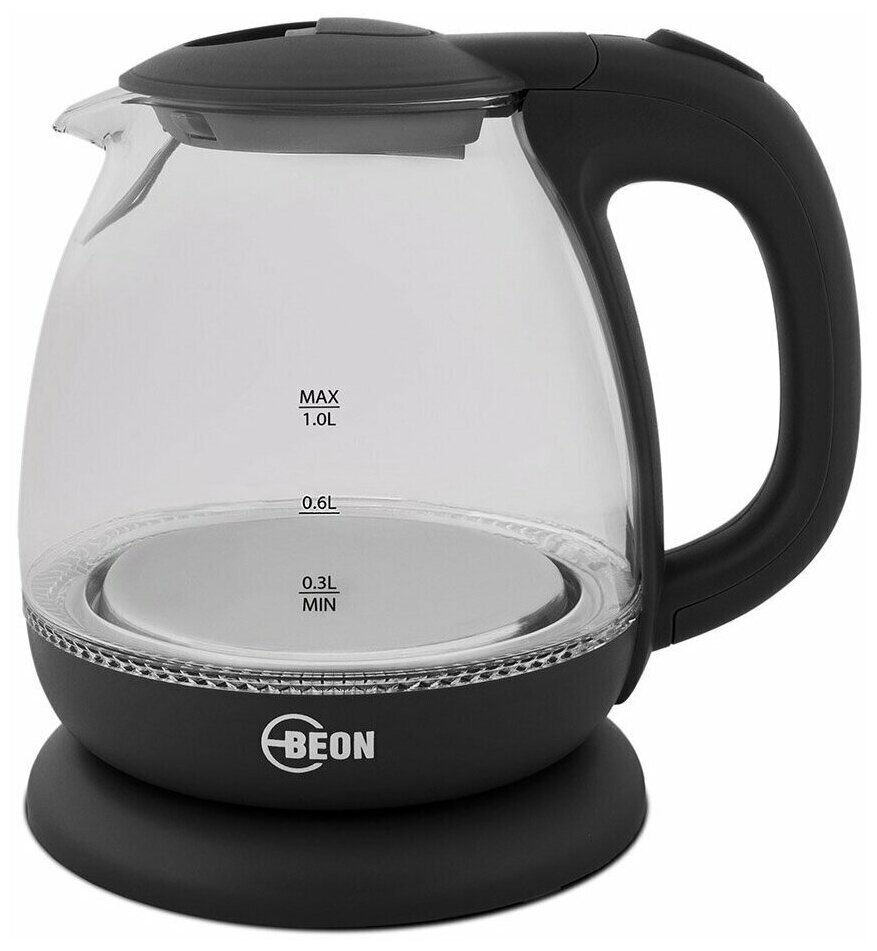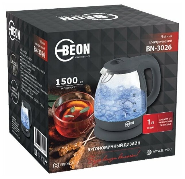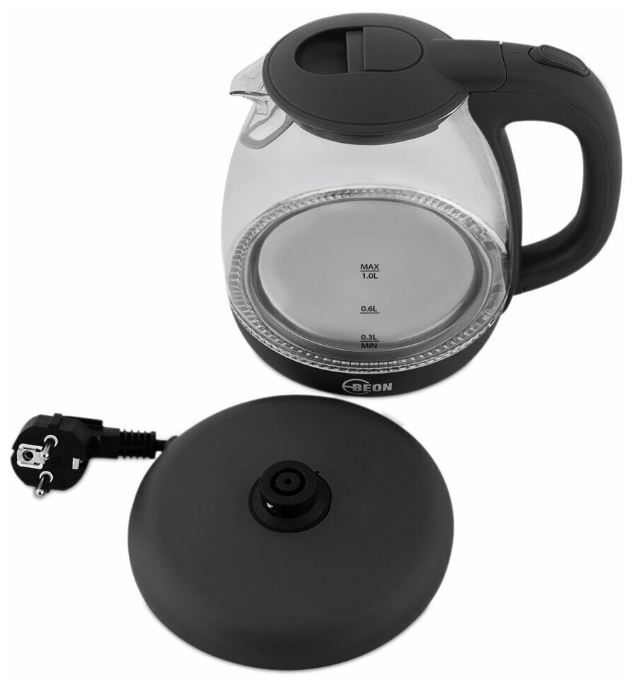 Легкий и прочный чайник BEON BN-3026, объемом 1 литр. Для быстрого закипания чайник оснащен нагревательным элементом мощностью 1500 Ватт. Чайник оснащен базой питания, позволяющей вращать его на 360 градусов и брать с любой стороны, что делает прибор более безопасным, а его эксплуатацию комфортной. Данная модель чайника выполнена из стекла. Цвет чайника -черный. Длина шнура -0,75м. У чайника есть внутренняя BLUE LED-подсветка, а также фильтр от накипи. Функция - автоотключение при закипании и защита от включения без воды делают безопасными его использование.