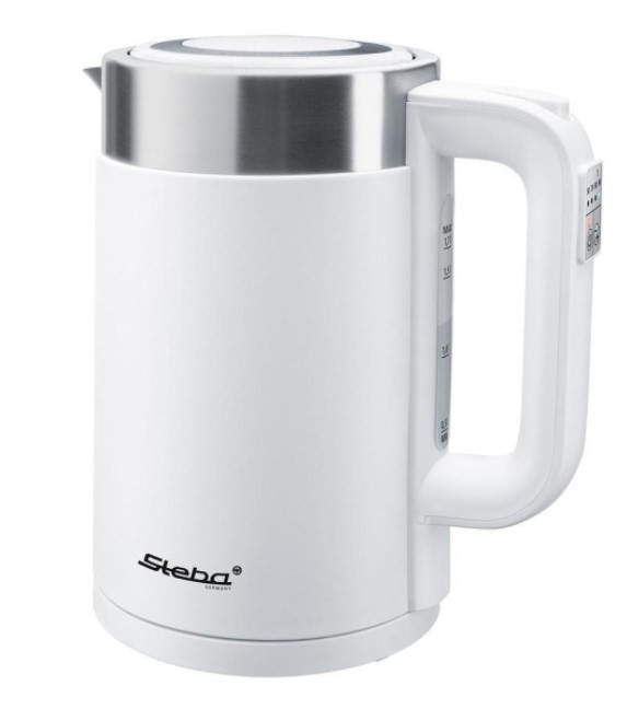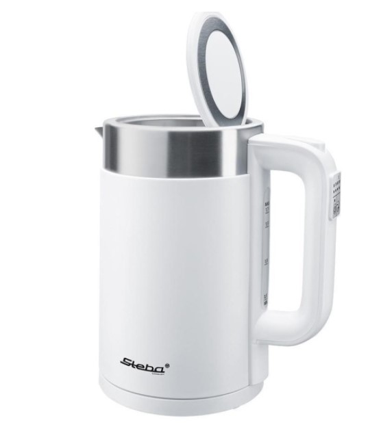 Чайник Steba WK 11 BIANCO с объемом 1.7 литров, двойные стенки корпуса с термоизоляцией (нержавеющая сталь внутри, пластик снаружи). Открытие крышки нажатием кнопки.