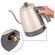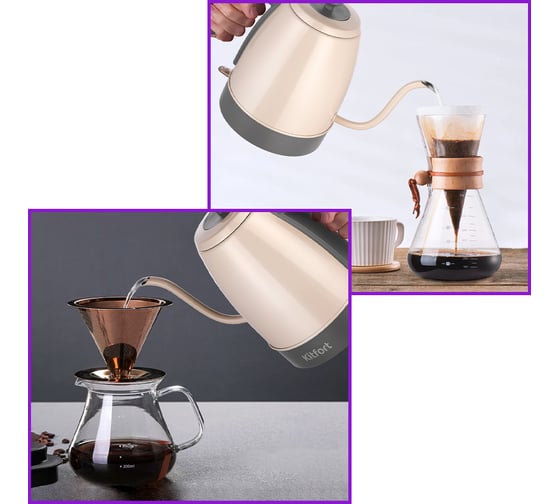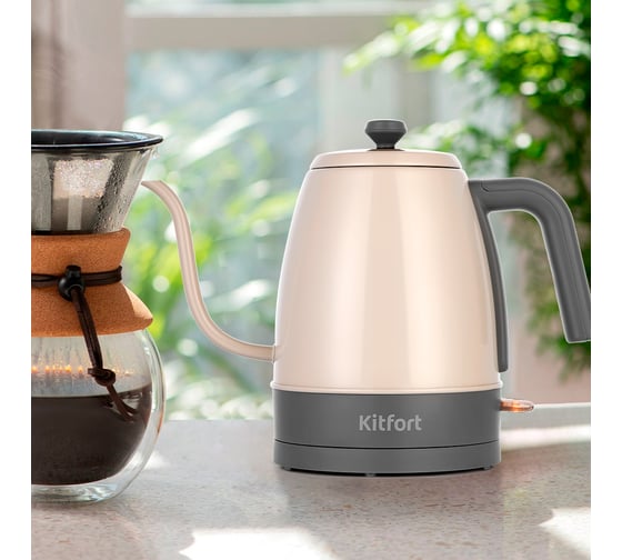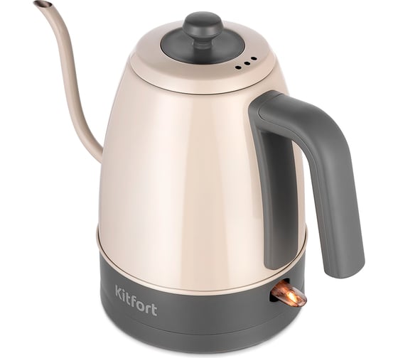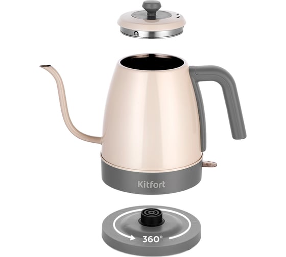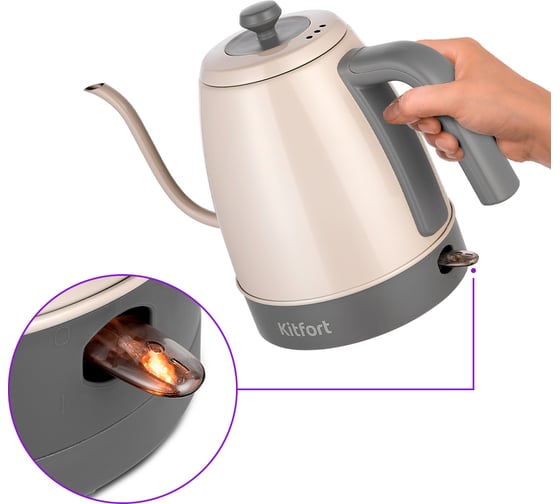 Корпус и крышка чайника выполнены из нержавеющей стали и пластика, а подставка — из пластмассы. Максимальная отметка нанесена внутри чайника. Ручка чайника пластиковая, не нагревается и удобно лежит в руке. Управление осуществляется с помощью переключателя, который расположен под ручкой. Нагревательный элемент (ТЭН) у этой модели чайника скрытый и находится в донной части. Сверху он закрыт специальной металлической пластиной из нержавеющей стали, благодаря которой исключается прямой контакт ТЭНа с водой. Такая конструкция препятствует образованию накипи, облегчает уход и значительно снижает шум при нагревании воды. Подставка с центральным контактом дает возможность располагать на ней чайник в любом положении, обеспечивая вращение на 360°. Снизу имеется отсек для хранения шнура, в который можно смотать излишки шнура электропитания, чтобы он не мешал на столе. Чайник автоматически отключается при закипании, имеет защиту от перегрева и от включения без воды. При закипании воды образующийся пар попадает в паропровод, проходит по нему и затем воздействует на термодатчик, который отключает чайник. Во время кипячения рекомендуется держать крышку плотно закрытой, иначе данный механизм может отработать неправильно.