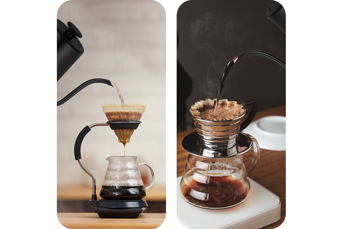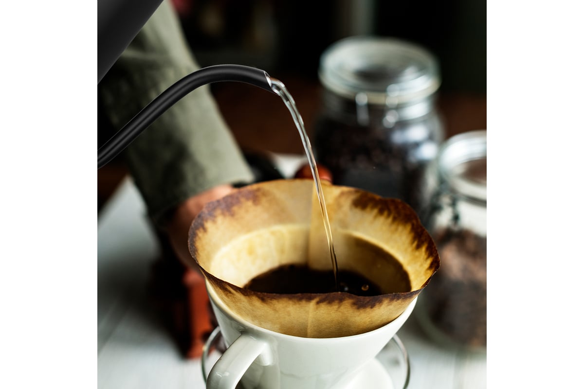 Длинный изогнутый носик чайника формирует тонкий и ровный поток воды, что является обязательным условием для приготовления кофе в кемексе или пуровере. Благодаря тонкому носику вы сможете постепенно и аккуратно добавлять воду в кофе, добиваясь равномерного процесса экстракции. Контролировать пролив воды с помощью обычного чайника неудобно, так как широкий носик не позволяет добиться точно направленного пролива воды с определенной скоростью, и в результате вкус и аромат кофе раскрывается не полностью.