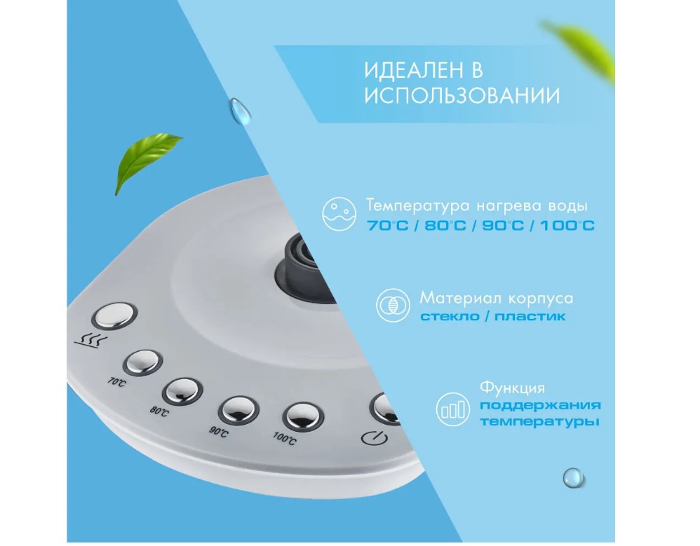 Дополнительными функциональными особенностями модели являются также двухсторонняя индикация уровня воды со шкалой, скрытый и безопасный нагревательный элемент, съемный фильтр-сетка, не пропускающий частицы накипи, и световой индикатор включения. Все это дополнено функцией поддержания температуры воды и 4-мя температурными режимами для подогрева воды.