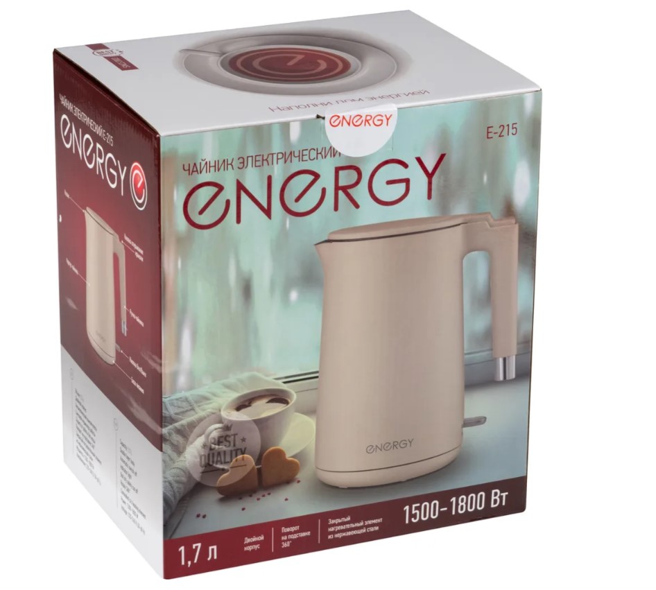 Чайник Energy E-215 (1,7 л), бежевый, двойной корпус - автоматически выключается, при закипании воды, а также, когда ее нет или недостаточно. Эта функция бережет чайник от раннего износа или сгорания.