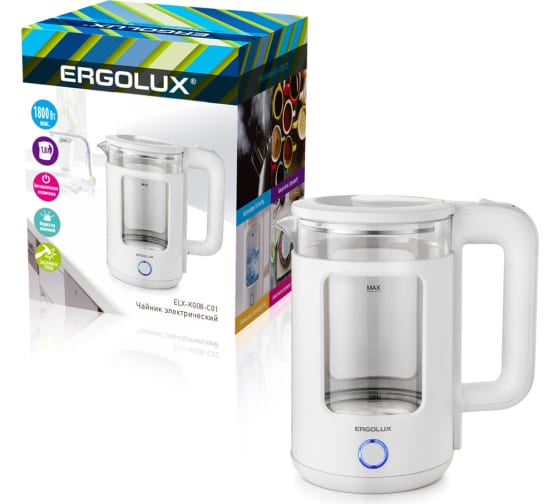 Чайник Ergolux предназначен для кипячения питьевой воды. Прозрачный корпус выполнен из закаленного стекла с пластиковыми вставками.