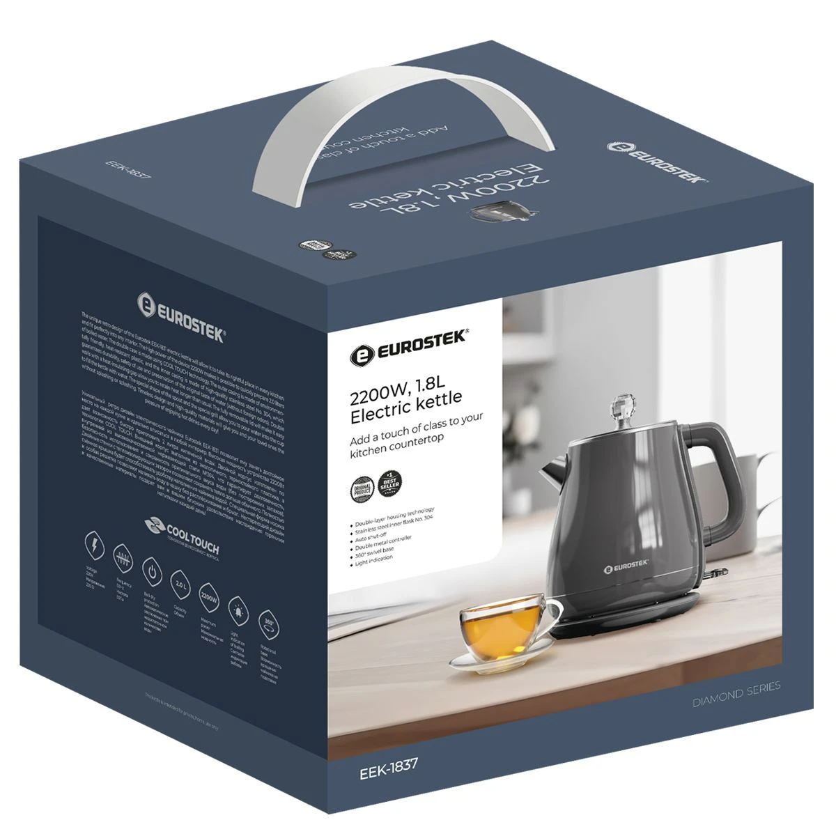Технология двухслойного корпуса COOL TOUCH, дисковый нагревательный элемент, световая индикация работы, вращения чайника на подставке на 360, автоматическое отключение при закипании и при недостаточном количестве воды.