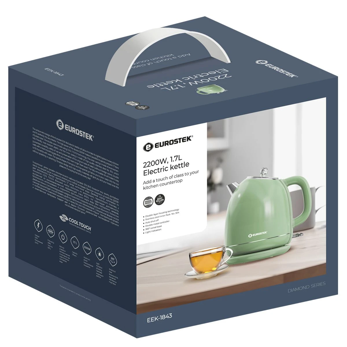 Технология двухслойного корпуса COOL TOUCH, дисковый нагревательный элемент, световая индикация работы, вращения чайника на подставке на 360, автоматическое отключение при закипании и при недостаточном количестве воды.