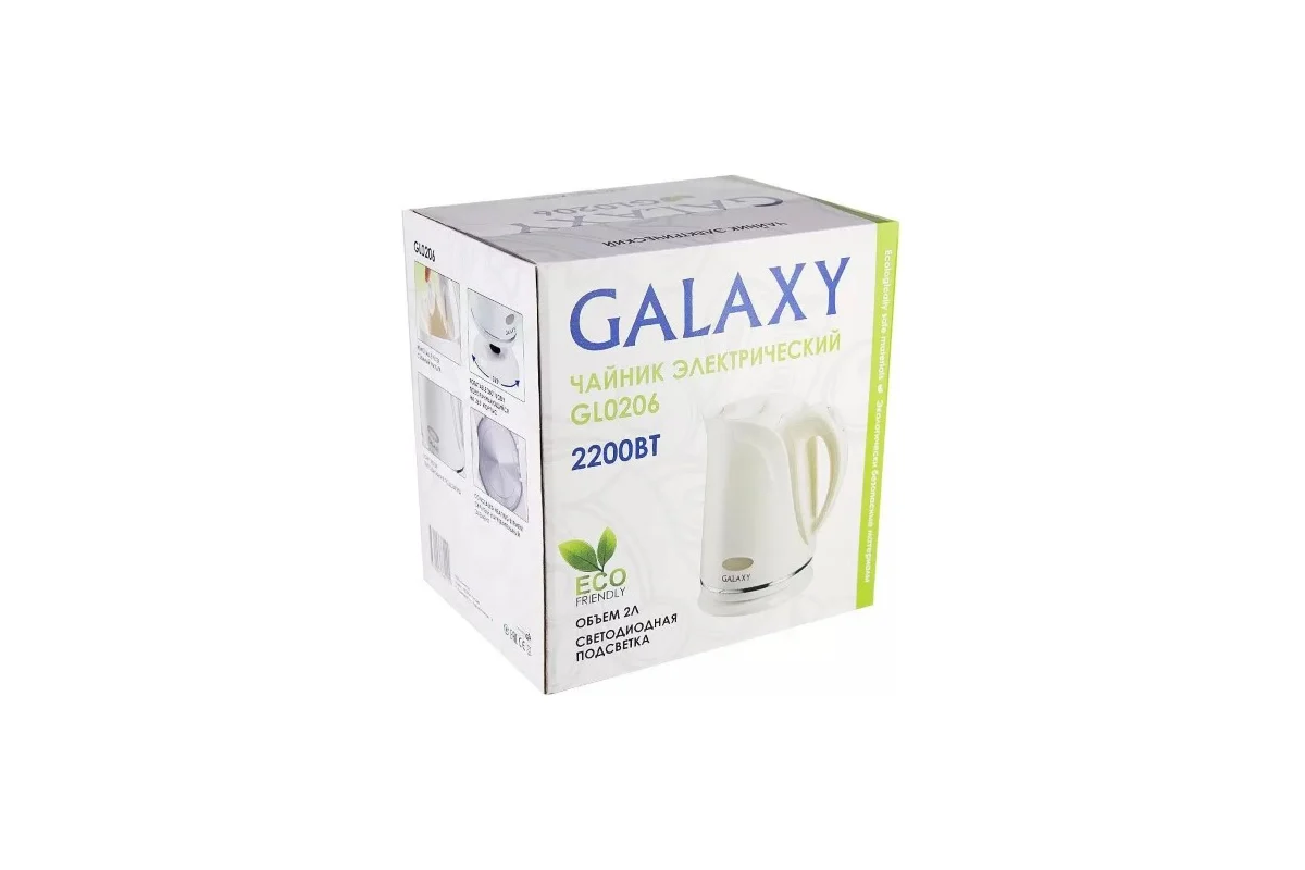 Электрический чайник Galaxy GL 0206 сочетает в себе функциональность и простоту использования. С объемом 2 литра и мощностью 2200 Вт, он быстро нагревает воду, что делает его идеальным для повседневного использования. Корпус из пластика в белом цвете придает устройству современный вид, а съемная крышка облегчает наполнение и очистку. Закрытый нагревательный элемент обеспечивает равномерное нагревание и долговечность. Наличие светодиодной подсветки и LED-индикатора работы позволяет легко контролировать процесс кипячения. Шкала уровня воды помогает точно отмерять необходимое количество жидкости. Вращение на подставке обеспечивает удобство в использовании, а защита от включения без воды повышает безопасность эксплуатации.