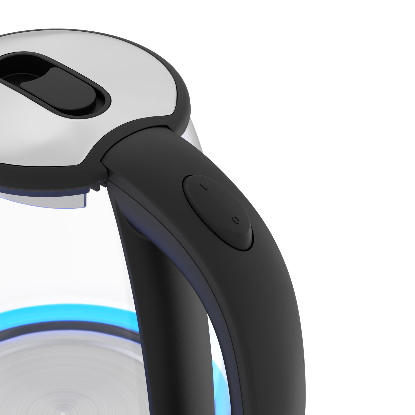 Прозрачный стеклянный чайник из термостойкого материала подчёркивает современный дизайн и позволяет наблюдать за процессом нагрева. Гладкая внутренняя поверхность и скрытый нагревательный элемент уменьшают образование налёта — накипь в чайнике скапливается значительно меньше, а уход становится проще.