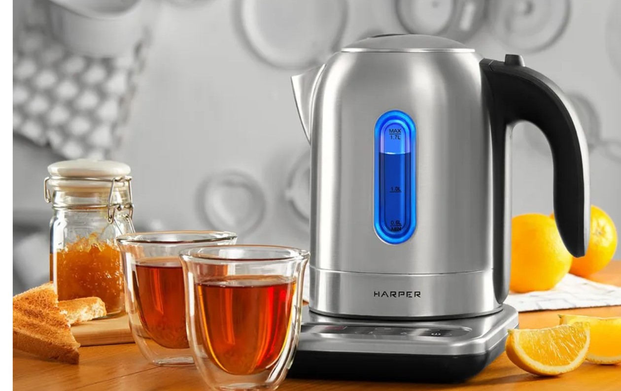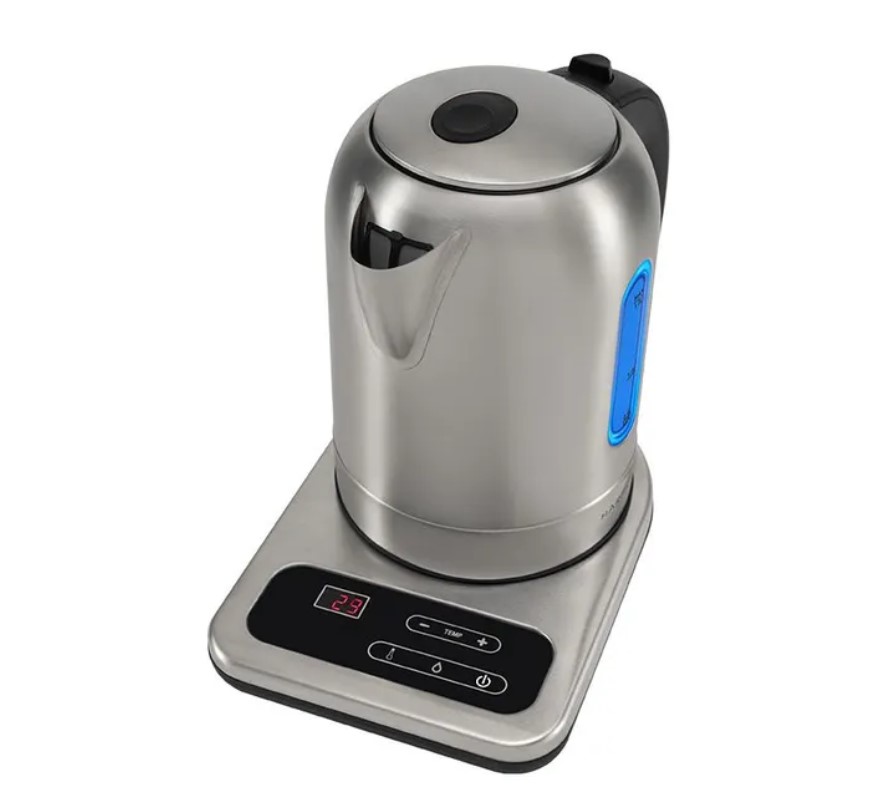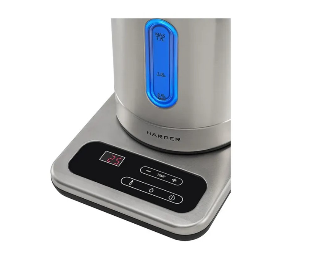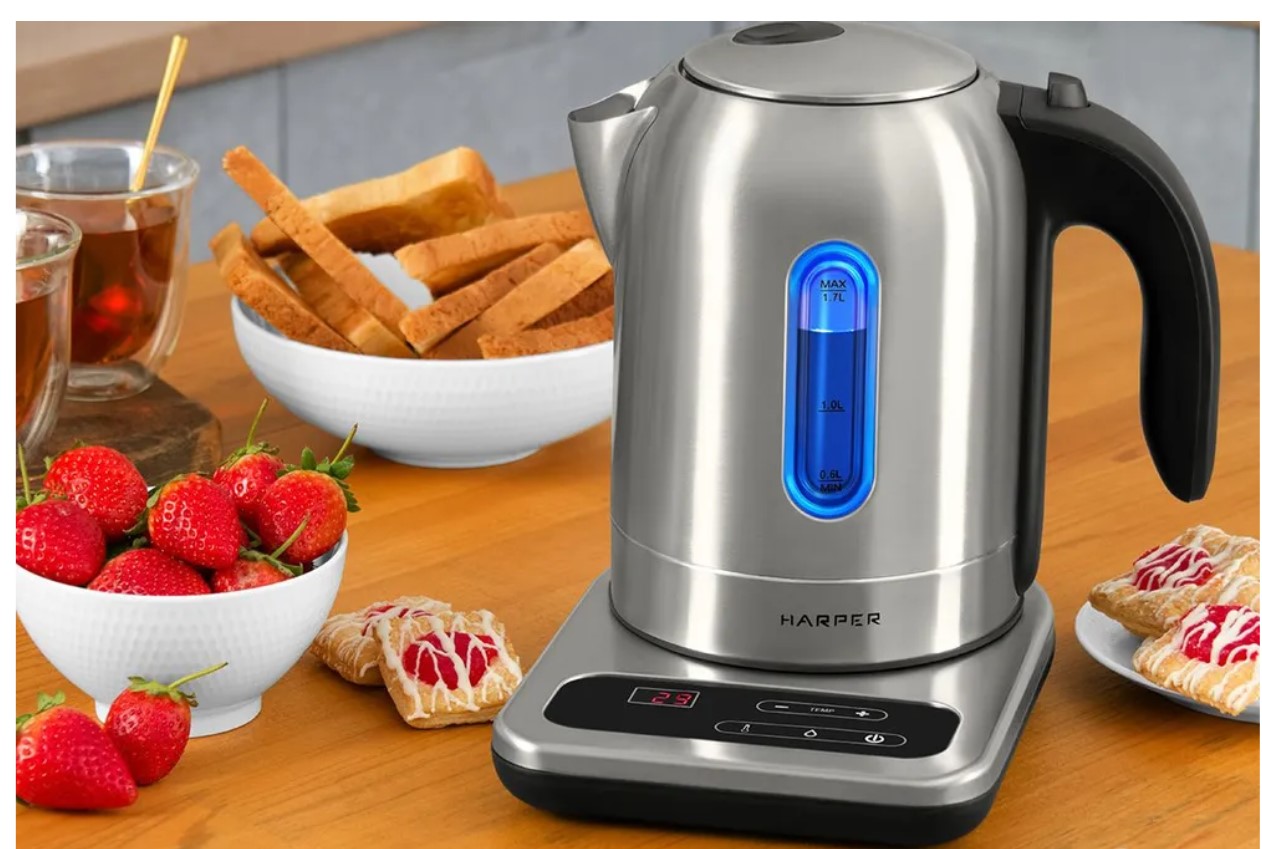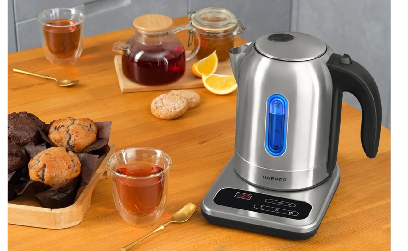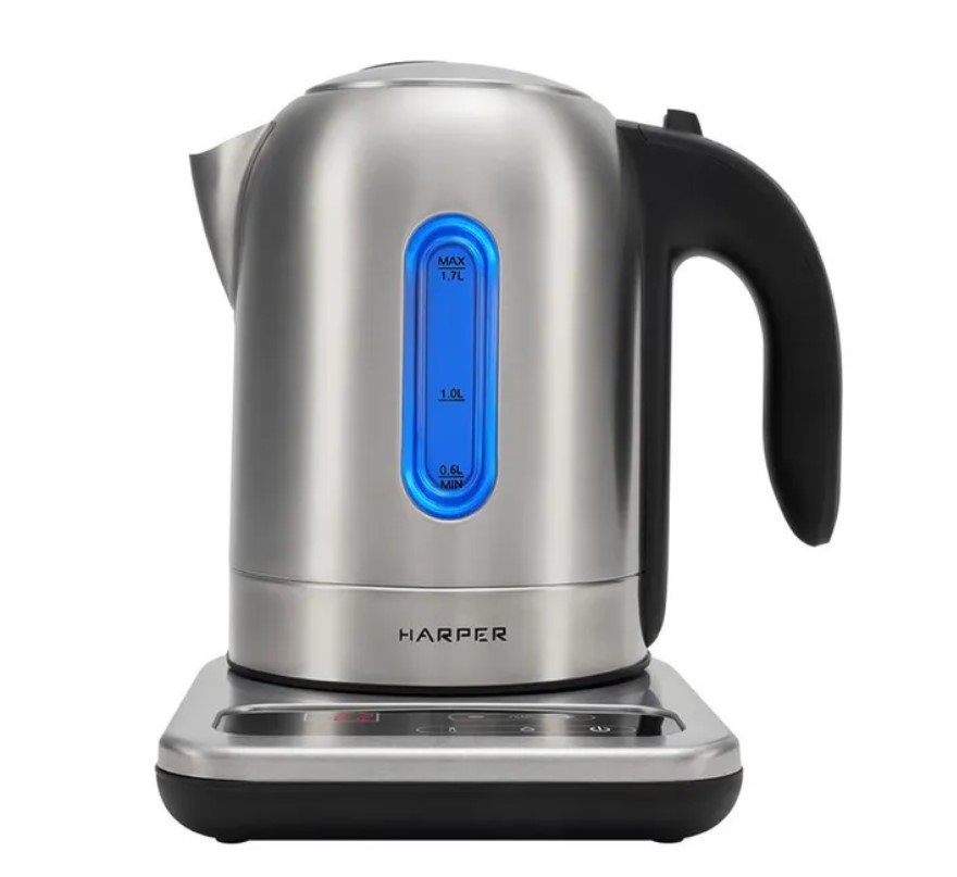Конструкция чайника: Дисплей, Индикатор уровня воды, Отсек для шнура, Светоиндикатор работы, Фильтр от накипи