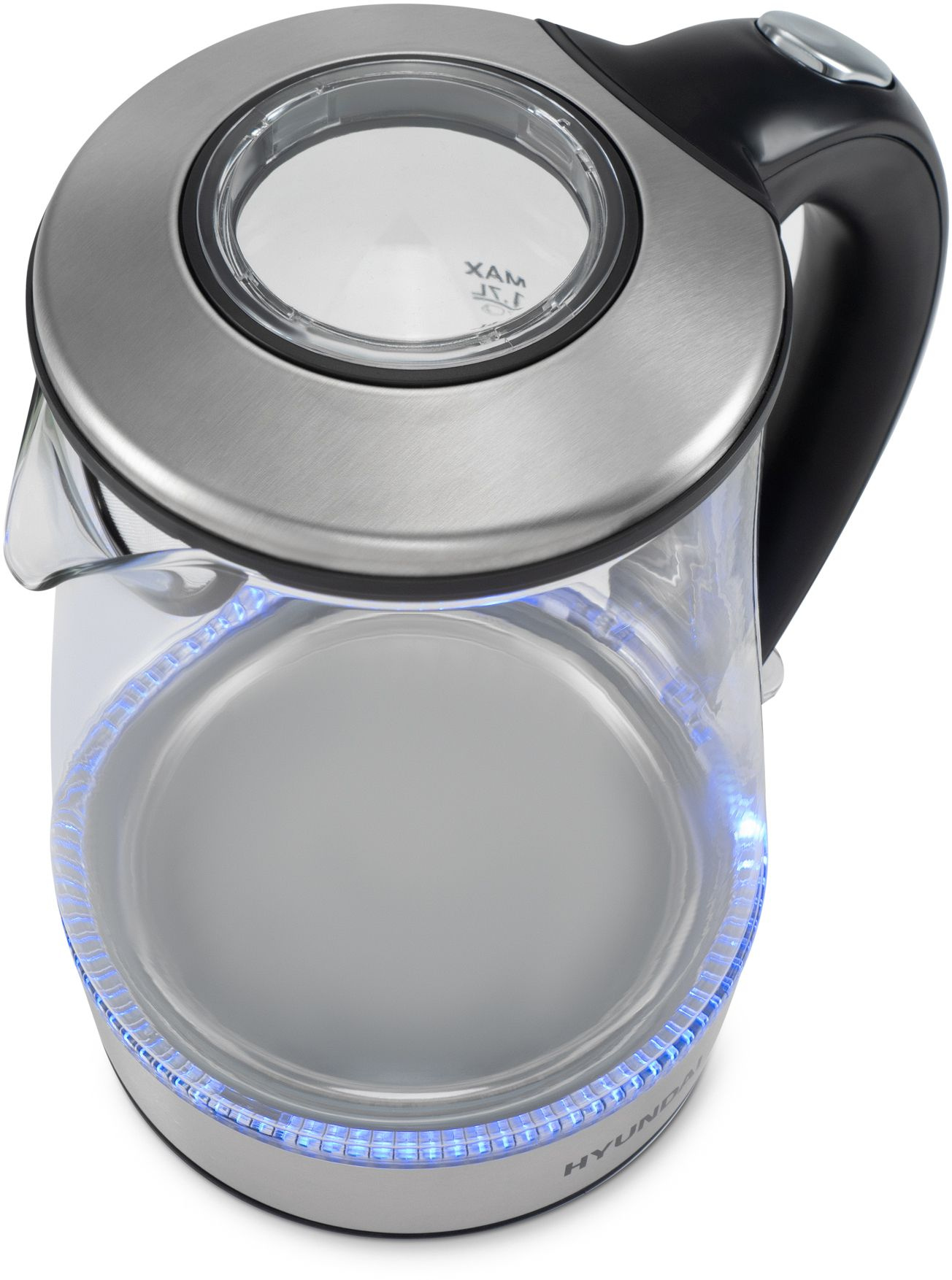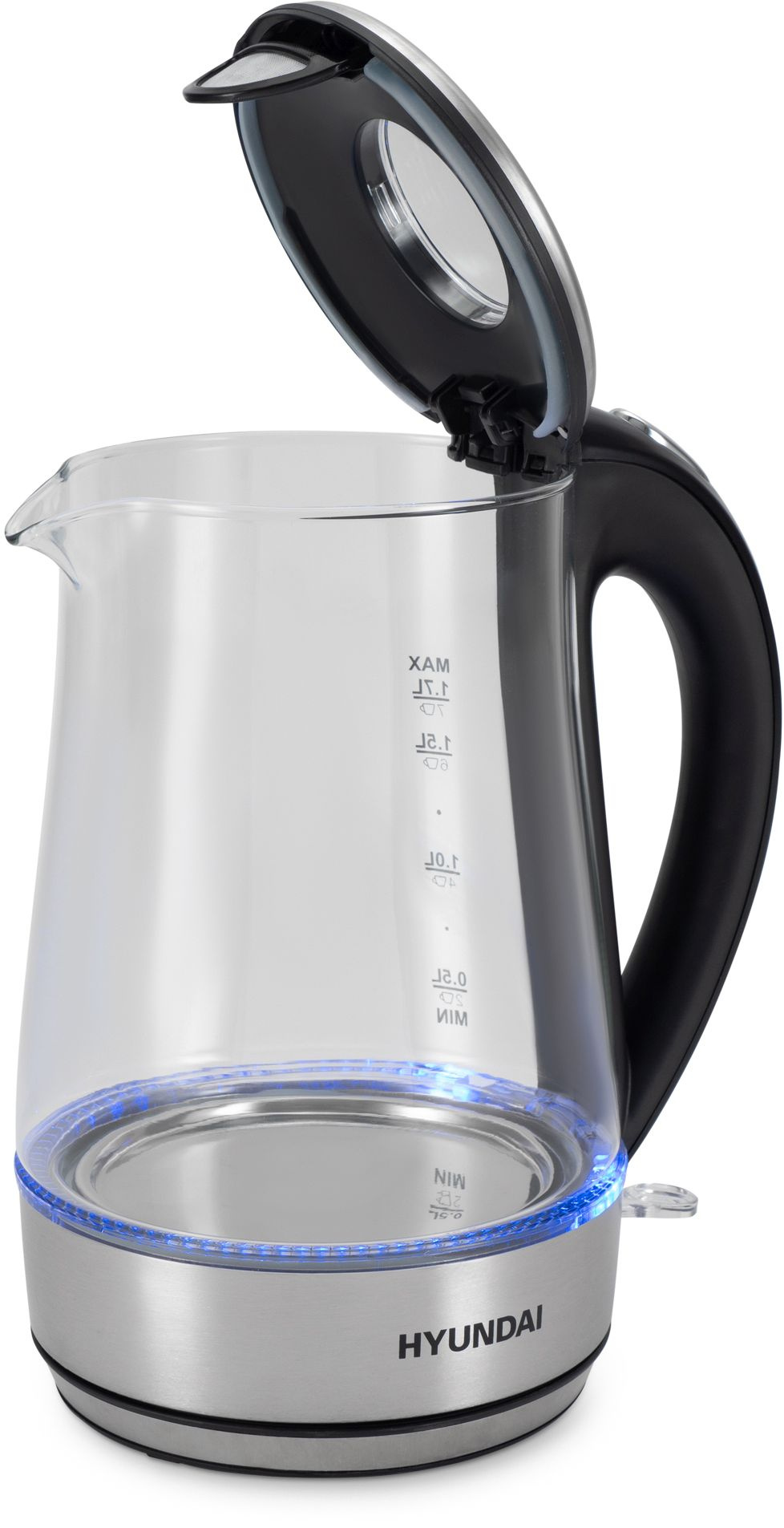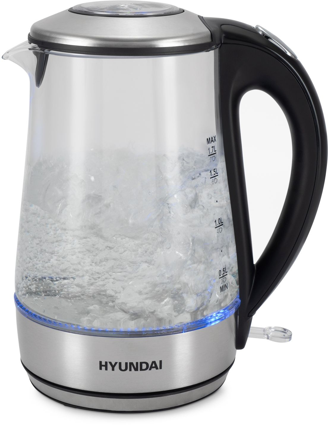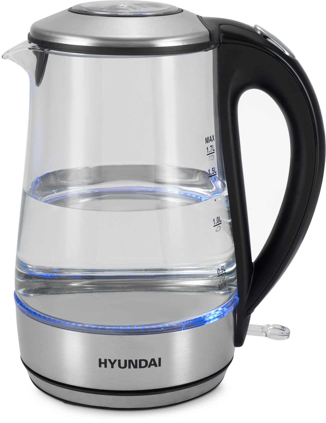 Стеклянно-металлический электрический чайник Hyundai HYK-G8406 объемом 1,7 л и мощностью 2200 Вт позволит быстро вскипятить 0,5-1,7 л воды. Модель оснащена голубой подсветкой и функцией автоматического отключения нагрева при закипании, а также встроенным фильтром от накипи.
