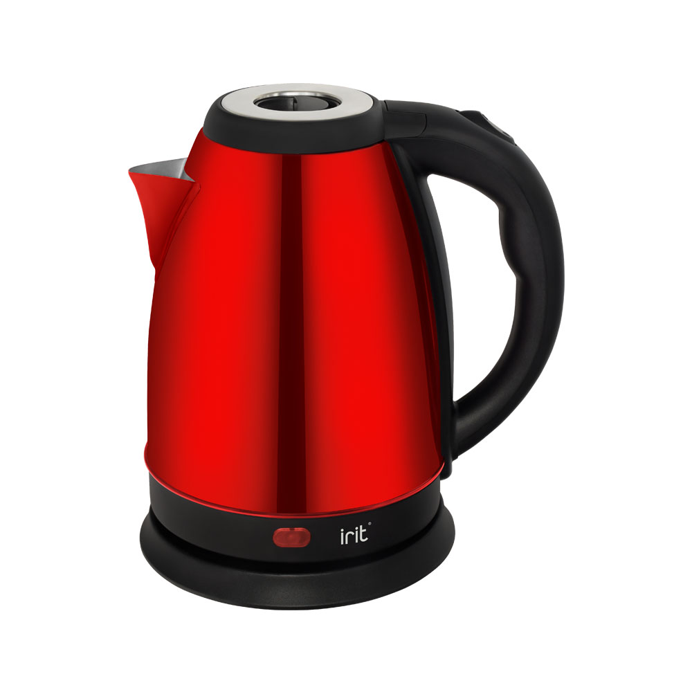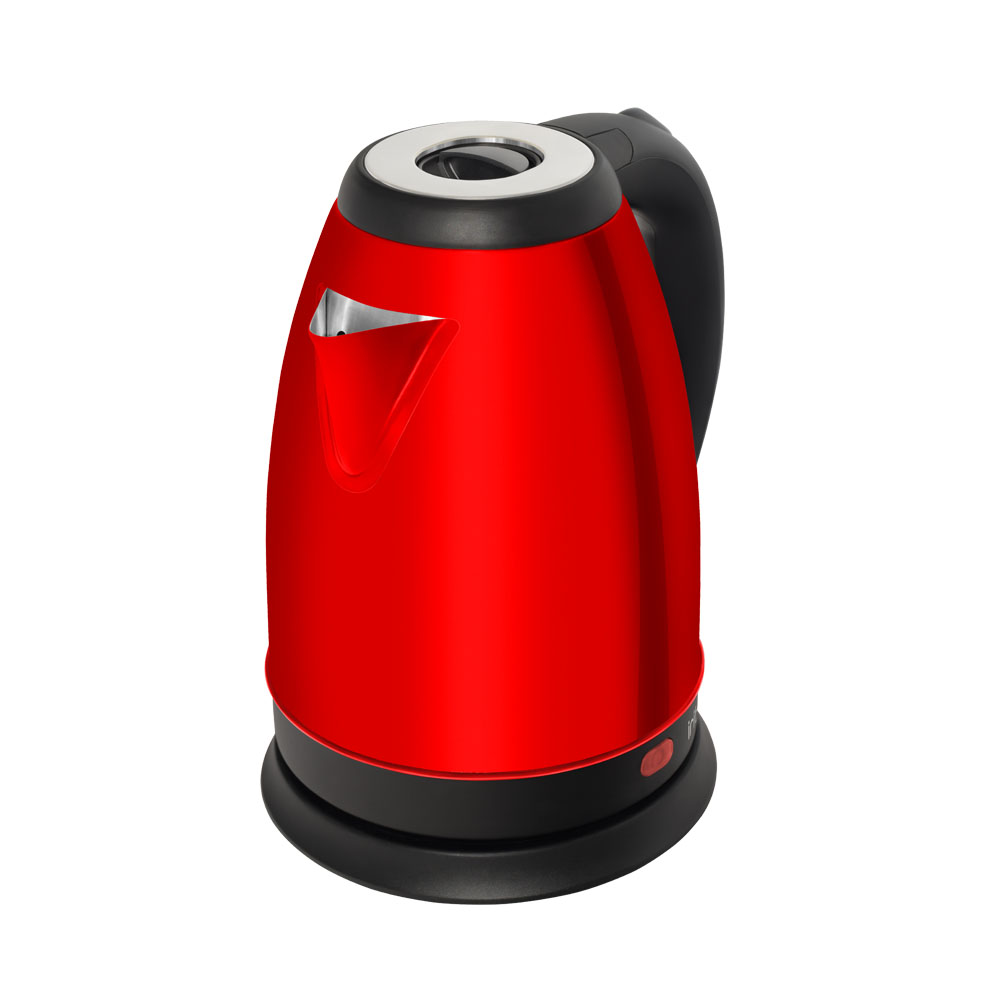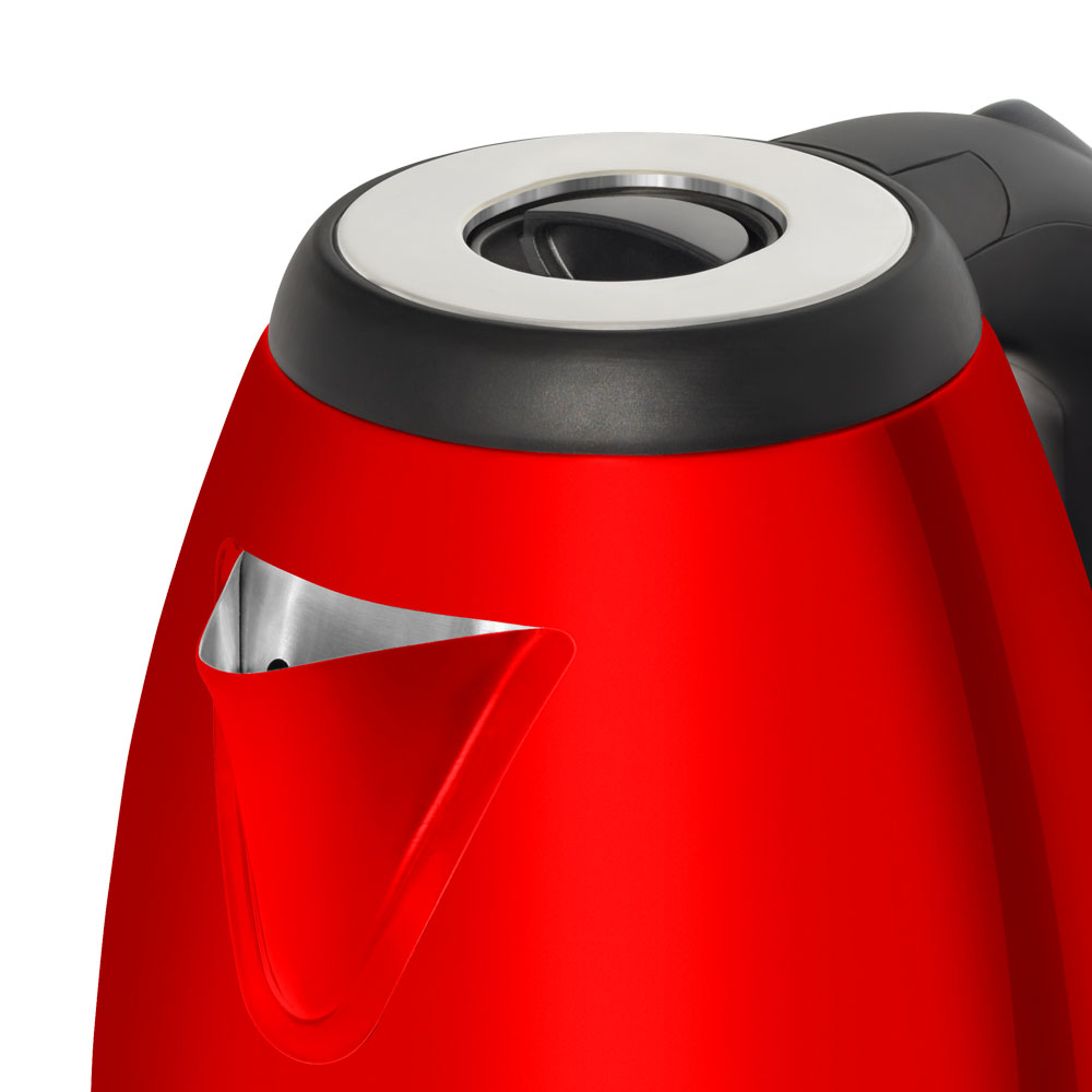 Чайник электрический, Мощность 1500 Вт, 2,1 л. Дисковый нагревательный элемент, корпус из нержавеющей стали, возможность поворота чайника на подставке 360°, автоотключение при вскипании, защита от работы без воды, световой индикатор работы. Цвет красный.