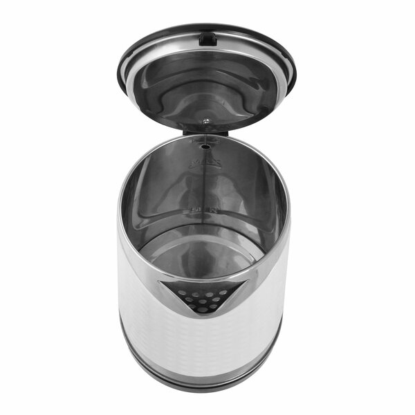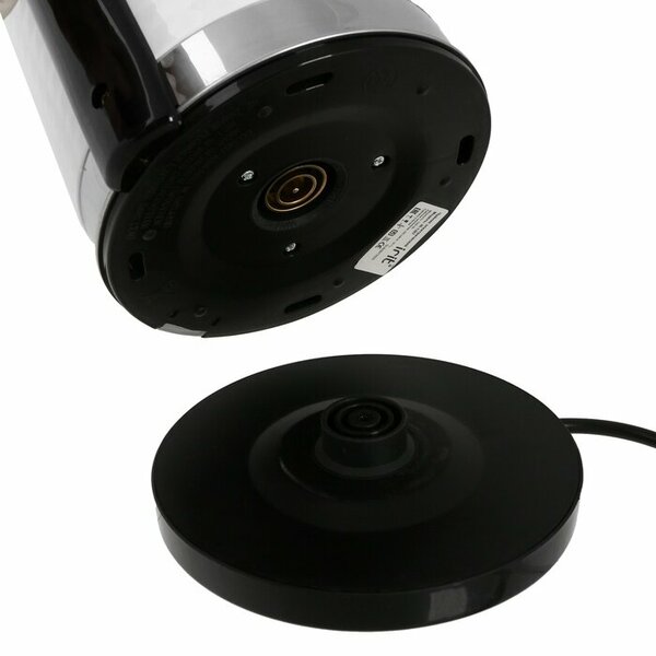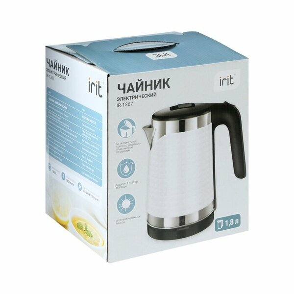 Чайник электрический мощностью 1500 Вт, объемом 1,8 л. Имеет дисковый нагревательный элемент, корпус из нержавеющей стали, возможность поворота чайника на подставке 360°, автоотключение при вскипании, защита от работы без воды, световой индикатор работы.