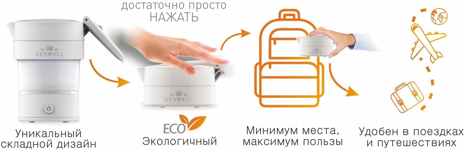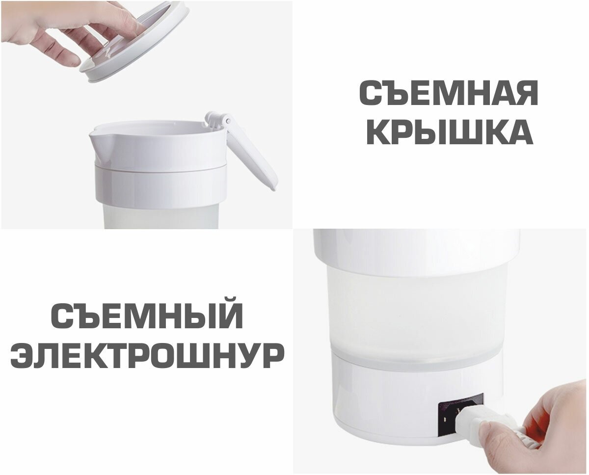 Чайник складной электрический H-120 станет прекрасным дополнением к вашим аксессуарам для активного отдыха. Благодаря максимальной мощности в 600 Вт и нагревательному элементу скрытого типа, он быстро вскипятит воду объемом до 0,6 литра. Материал корпуса изготовлен из пищевого силикона. В данном чайнике присутствуют функции защита от включения без воды, защита от перегрева, кнопка вкл/выкл с подсветкой, функция подогрева. Уникальный складной дизайн, компактный и легкий, cкладная ручка, cъемная крышка и электрошнур. На рынке бытовой техники, дорожный чайник H-120, пользуется неизменной популярностью благодаря высокому качеству, безопасности и удобству в использовании.