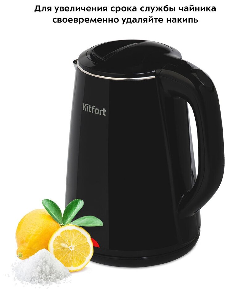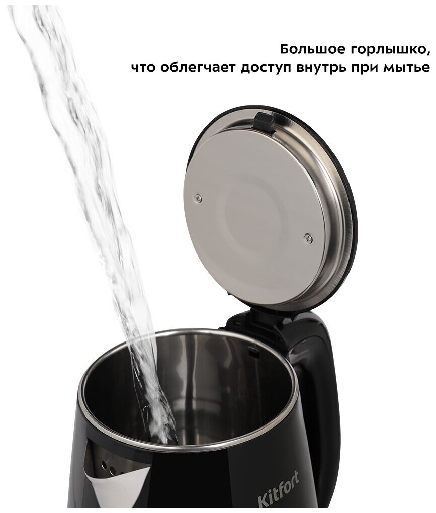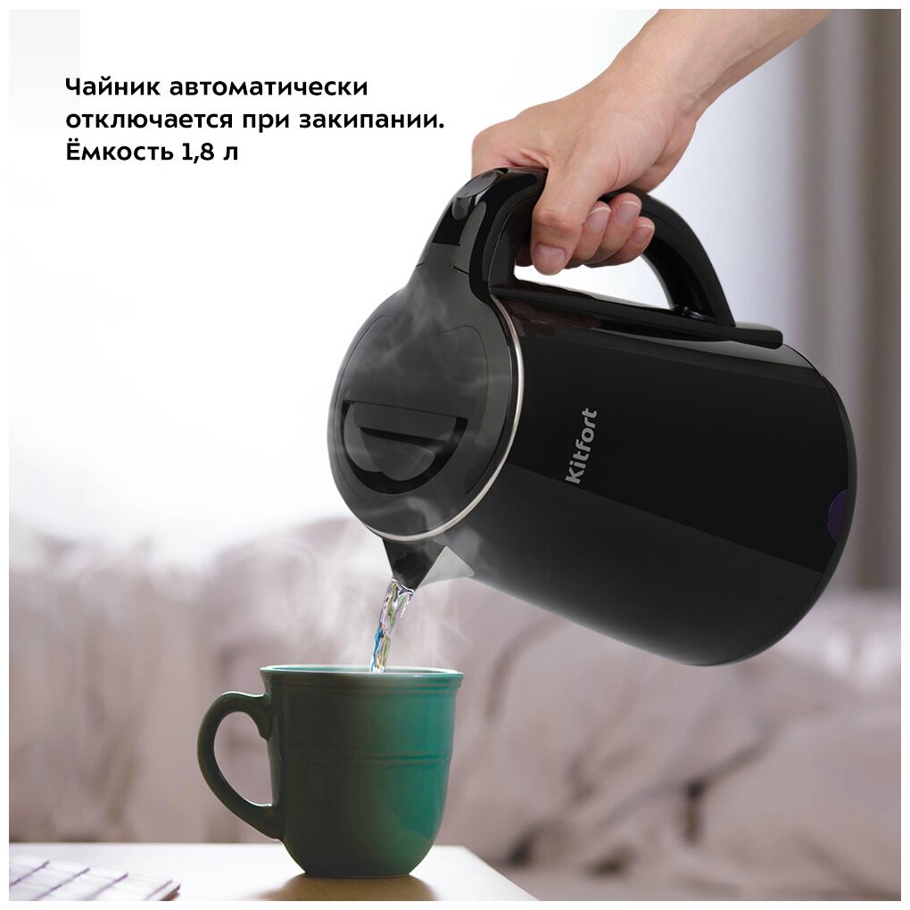 Электрический чайник Kitfort КТ-6160 предназначен для кипячения воды дома, в офисе, на даче. Внутренняя поверхность чайника полностью состоит из металла, благодаря чему вода не соприкасается с пластиком. За один раз в чайнике можно вскипятить 1,8 л воды.