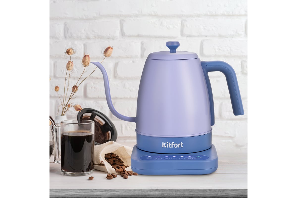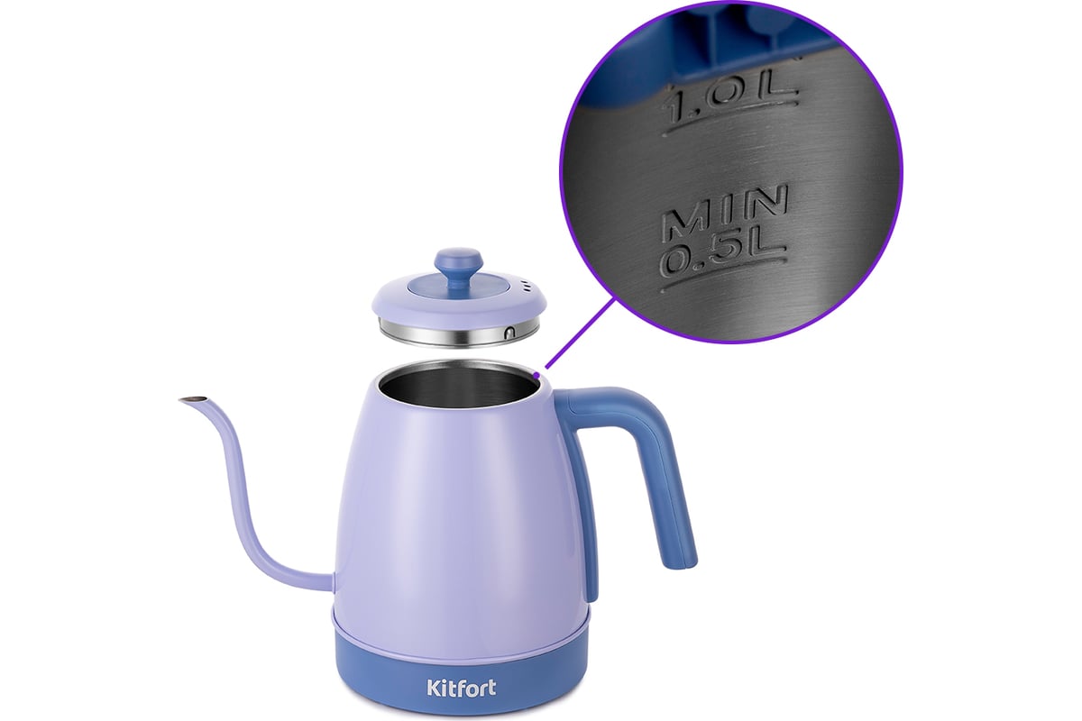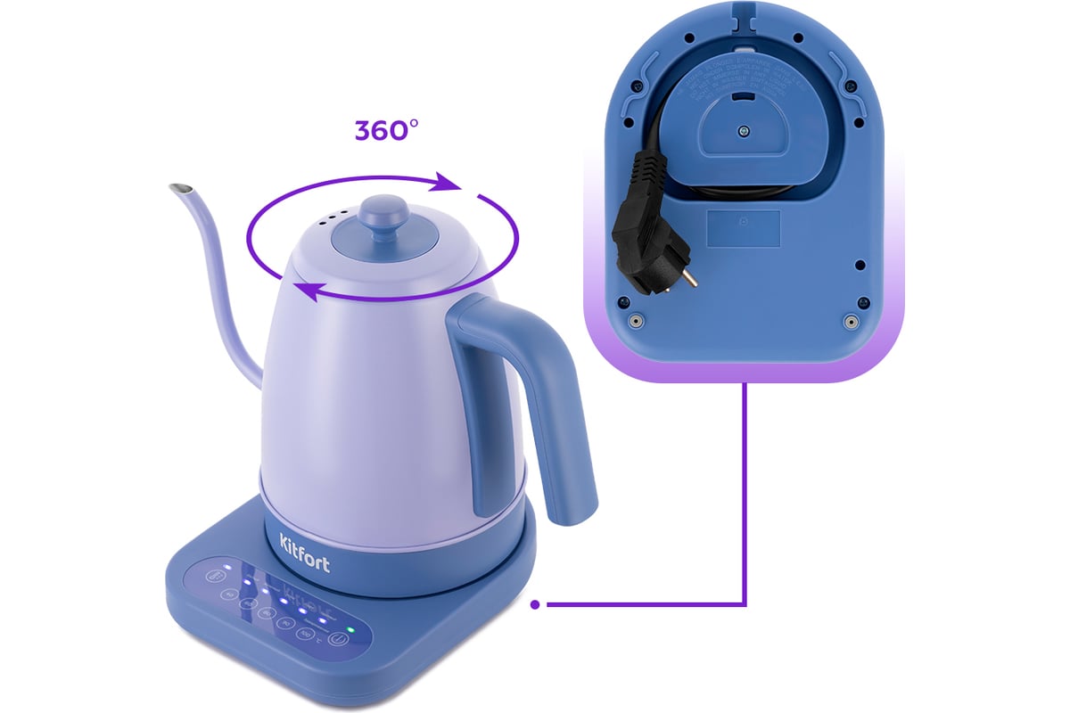 Длинный изогнутый носик чайника формирует тонкий и ровный поток воды, что является обязательным условием для приготовления кофе в кемексе или пуровере. Благодаря тонкому носику вы сможете постепенно и аккуратно добавлять воду в кофе, добиваясь равномерной экстракции. Контролировать пролив воды с помощью обычного чайника неудобно, так как широкий носик не позволяет добиться точно направленной струи воды с определенной скоростью, и в результате вкус и аромат кофе раскрывается не полностью. Корпус и крышка чайника выполнены из нержавеющей стали и пластика, а база — из пластмассы. Максимальная отметка нанесена внутри чайника. Ручка чайника пластиковая, не нагревается и удобно лежит в руке. Нагревательный элемент (ТЭН) у этой модели чайника скрытый и находится в донной части. Сверху он закрыт специальной металлической пластиной из нержавеющей стали, благодаря которой исключается прямой контакт ТЭНа с водой. Такая конструкция препятствует образованию накипи, облегчает уход и значительно снижает шум при нагревании воды. База с центральным контактом дает возможность располагать на ней чайник в любом положении, обеспечивая вращение на 360°. Управление осуществляется с помощью панели управления на базе. Чайник автоматически отключается при закипании, имеет защиту от перегрева и от включения без воды. При закипании воды образующийся пар попадает в паропровод, проходит по нему и затем воздействует на термодатчик, который отключает чайник.