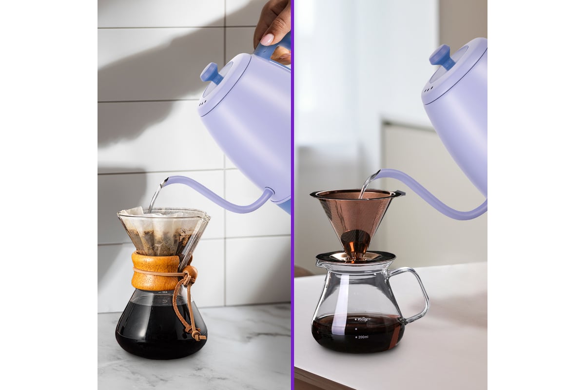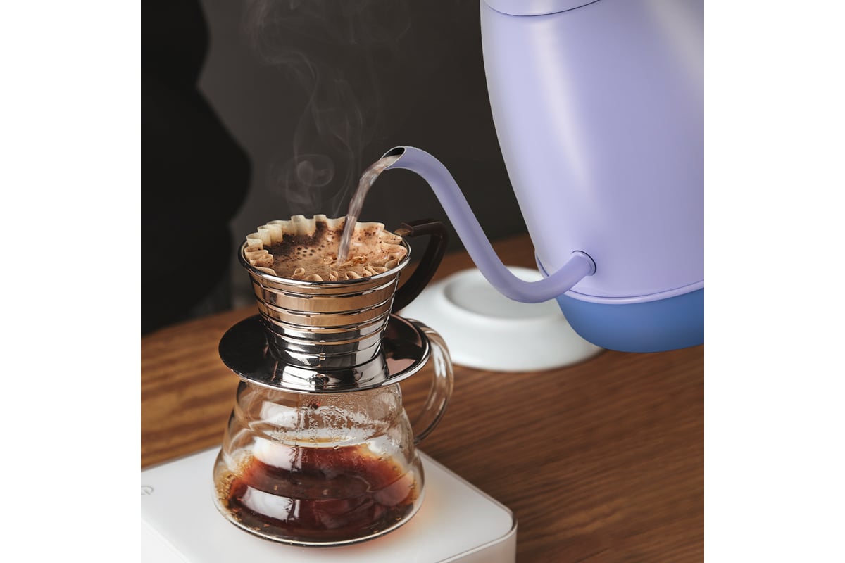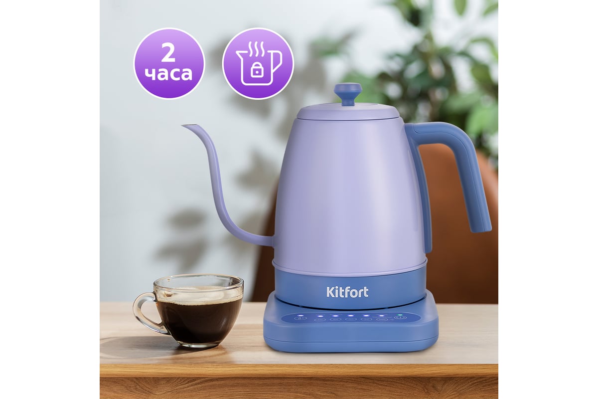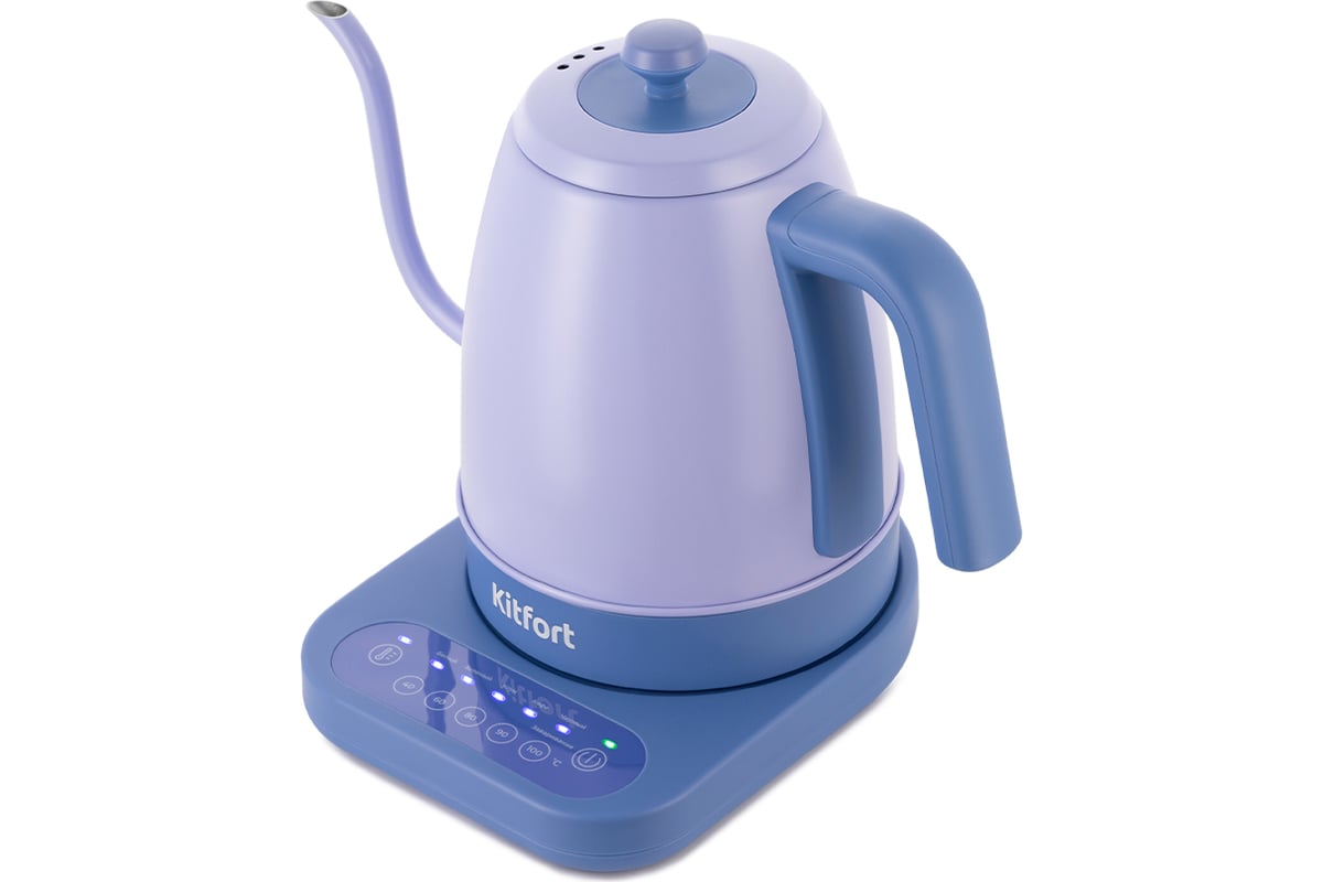Длинный изогнутый носик чайника формирует тонкий и ровный поток воды, что является обязательным условием для приготовления кофе в кемексе или пуровере. Благодаря тонкому носику вы сможете постепенно и аккуратно добавлять воду в кофе, добиваясь равномерной экстракции. Контролировать пролив воды с помощью обычного чайника неудобно, так как широкий носик не позволяет добиться точно направленной струи воды с определенной скоростью, и в результате вкус и аромат кофе раскрывается не полностью. Корпус и крышка чайника выполнены из нержавеющей стали и пластика, а база — из пластмассы. Максимальная отметка нанесена внутри чайника. Ручка чайника пластиковая, не нагревается и удобно лежит в руке. Нагревательный элемент (ТЭН) у этой модели чайника скрытый и находится в донной части. Сверху он закрыт специальной металлической пластиной из нержавеющей стали, благодаря которой исключается прямой контакт ТЭНа с водой. Такая конструкция препятствует образованию накипи, облегчает уход и значительно снижает шум при нагревании воды. База с центральным контактом дает возможность располагать на ней чайник в любом положении, обеспечивая вращение на 360°. Управление осуществляется с помощью панели управления на базе. Чайник автоматически отключается при закипании, имеет защиту от перегрева и от включения без воды. При закипании воды образующийся пар попадает в паропровод, проходит по нему и затем воздействует на термодатчик, который отключает чайник.