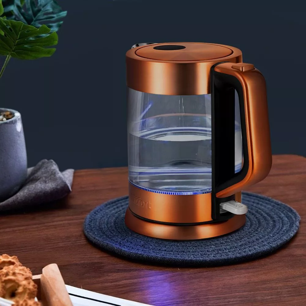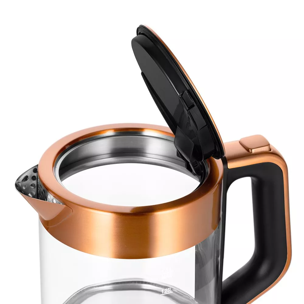 Корпус чайника выполнен из сочетания стекла, нержавеющей стали и пластика. Для того, чтобы открыть крышку, зажмите кнопку на ручке чайника. Переключатель для включения расположен под ручкой.