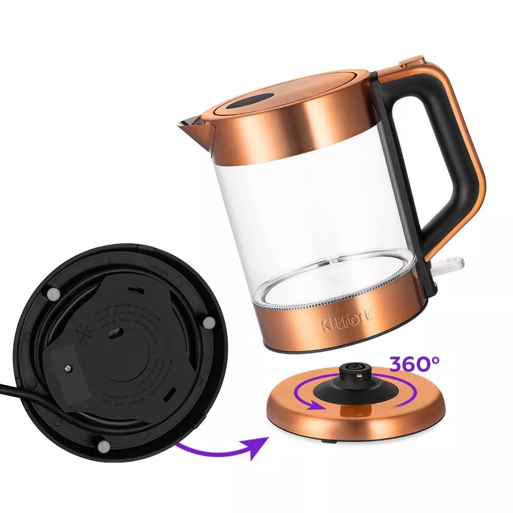 Подставка с центральным контактом даёт возможность располагать на ней чайник в любом положении, обеспечивая вращение на 360°. Снизу имеется отсек для хранения шнура, в который можно смотать излишки шнура электропитания, чтобы он не мешал на столе.