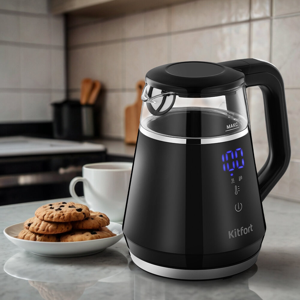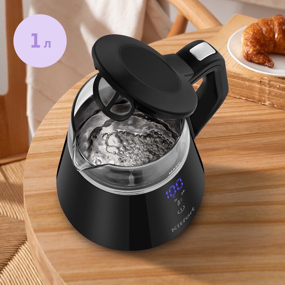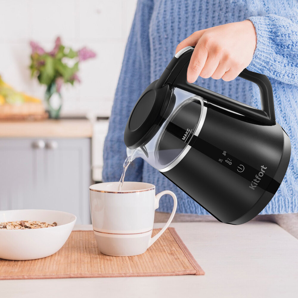 Электрический чайник с электронным терморегулятором может не только вскипятить воду, но и нагреть её до 40,70,80 и 90 °C, что очень удобно при заваривании различных сортов чая. Чайник также оснащён функцией поддержания температуры в течение 2 часов.