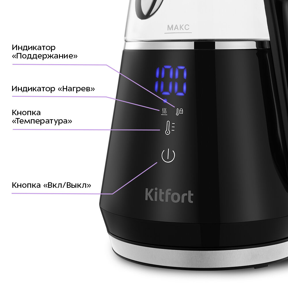 При подключении к сети питания чайник переходит в режим ожидания, при этом горит только дисплей. Чайник автоматически отключается при закипании, имеет защиту от перегрева и от включения без воды.