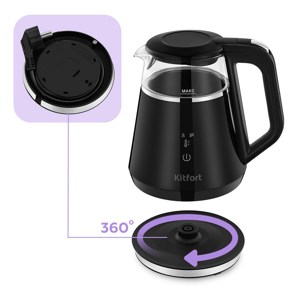 Подставка с центральным контактом даёт возможность располагать на ней чайник в любом положении, обеспечивая вращение на 360°. С обратной стороны подставки расположены пазы для хранения шнура.
